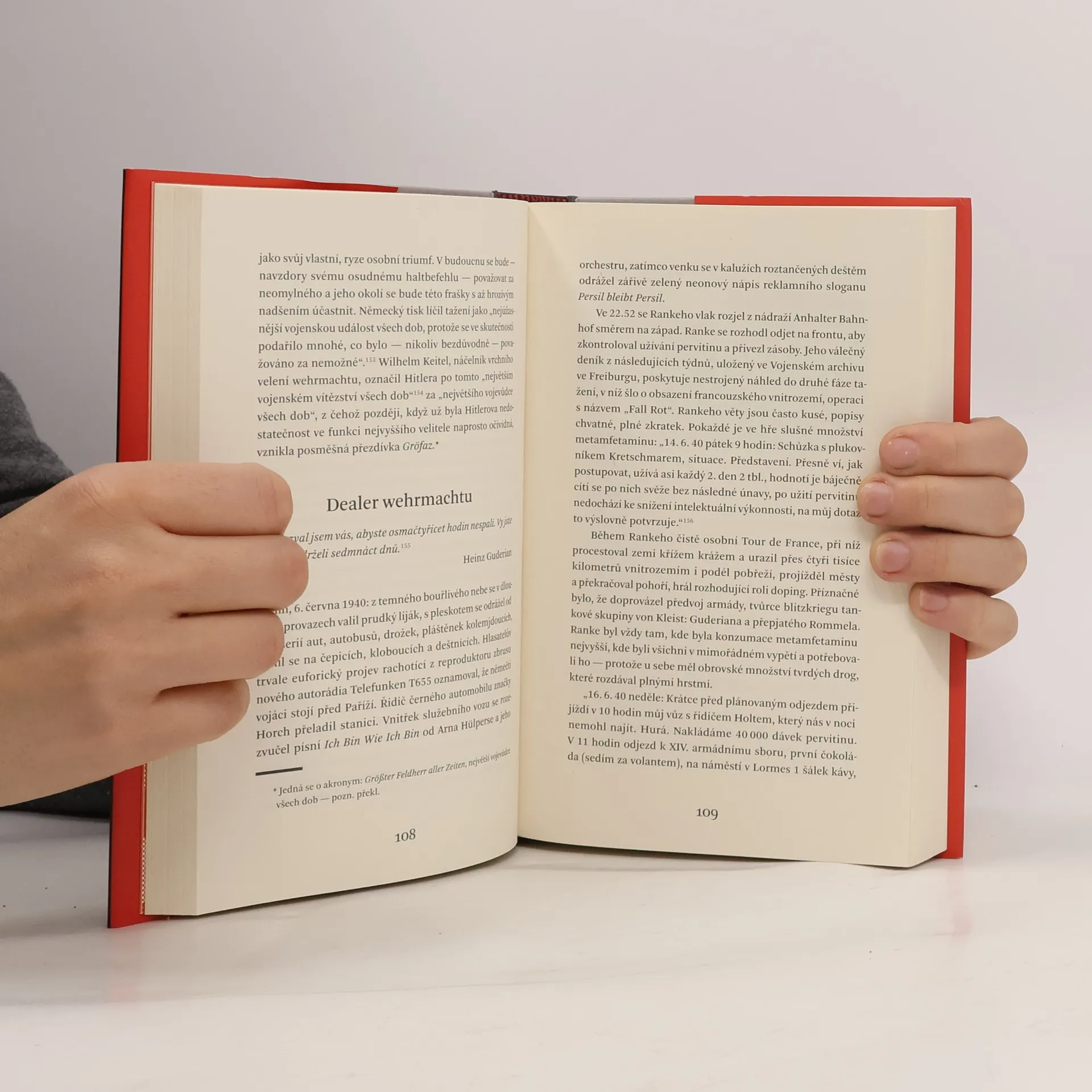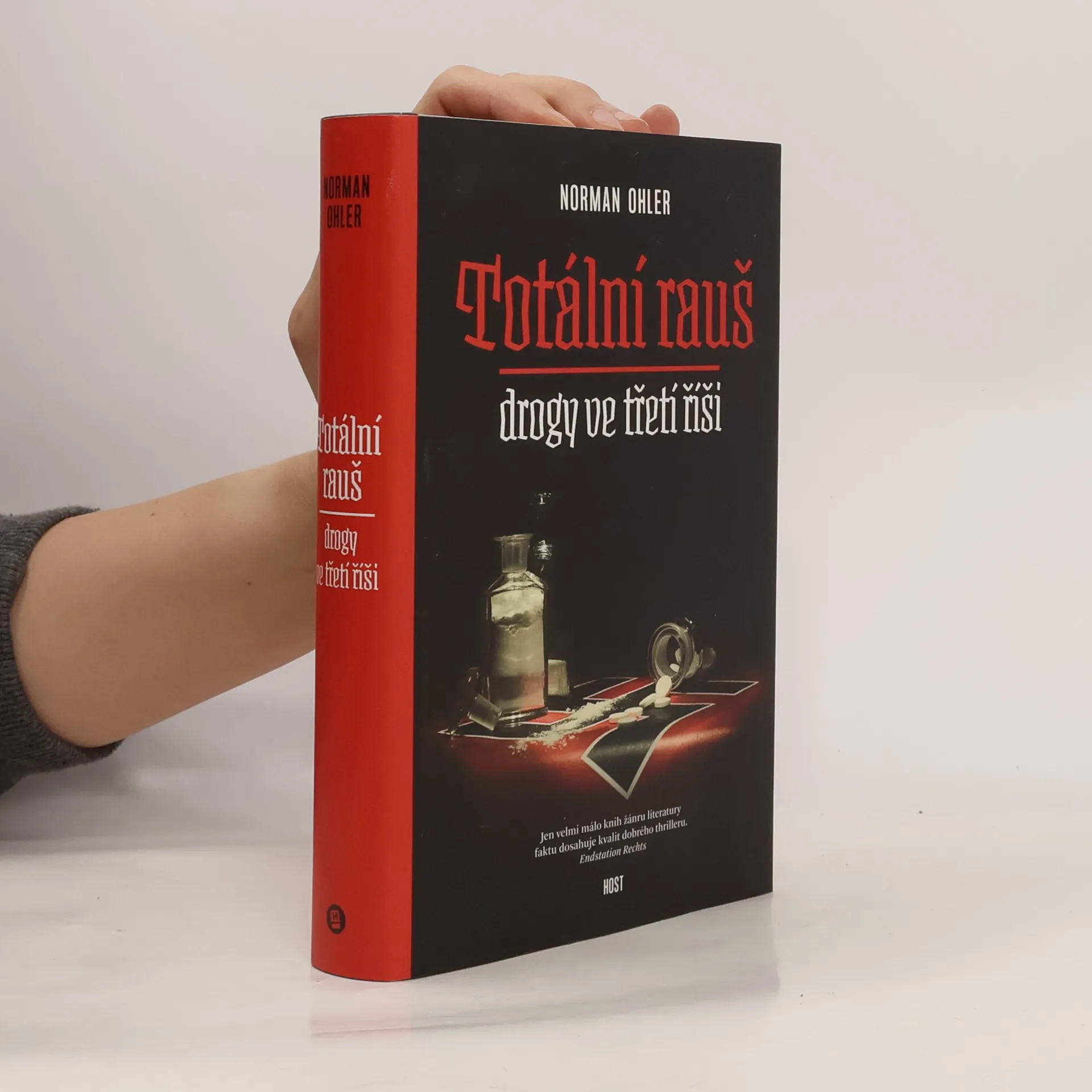 Strhující jako thriller – první komplexní studie drogové problematiky ve třetí říši. Když Němci v roce 1940 vtrhli do Francie, měli vojáci wehrmachtu k dispozici třicet pět milionů dávek pervitinu. Látka – dnes mezinárodně známá jako meth – byla tehdy k dostání v každé lékárně. Droga měla umožnit tzv. bleskovou válku a stala se běžnou součástí výbavy vojáků. Dokonce i údajný abstinent Hitler se rád uchyloval k farmaceutickým stimulantům. V době, kdy nařídil poslední ofenzivu v zimě roku 1944, nebyl čistý ani jeden den. Jeho osobní lékař Theo Morell jej zásoboval všemi druhy léků, hormonů i tvrdých drog. Pouze v tomto stavu mohl vůdce vydržet tak dlouho. Ohler prošel všechny materiály k tématu, hovořil s pamětníky, vojenskými historiky i lékaři. Na knize se podílel přední historik Hans Mommsen, který také napsal doslov.
