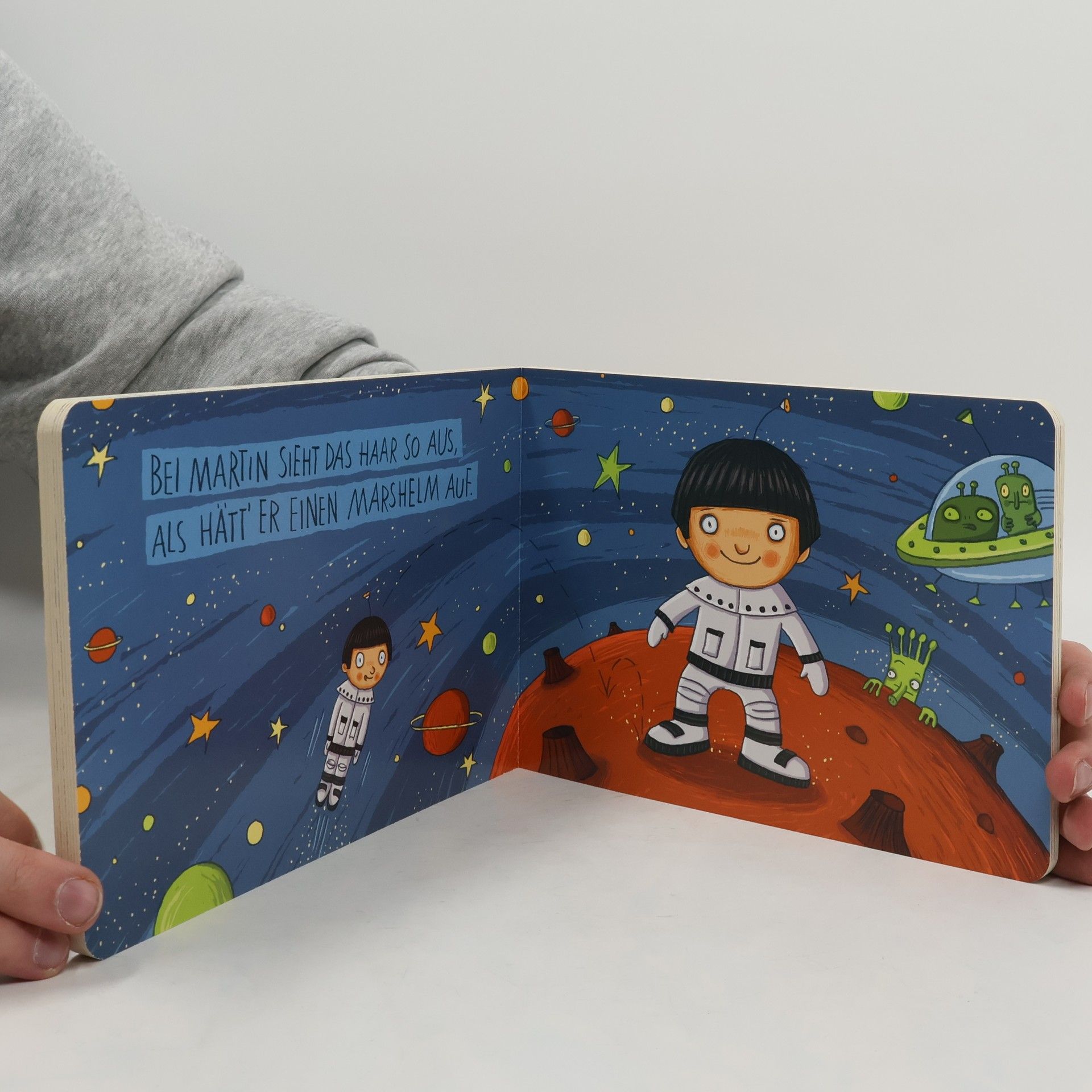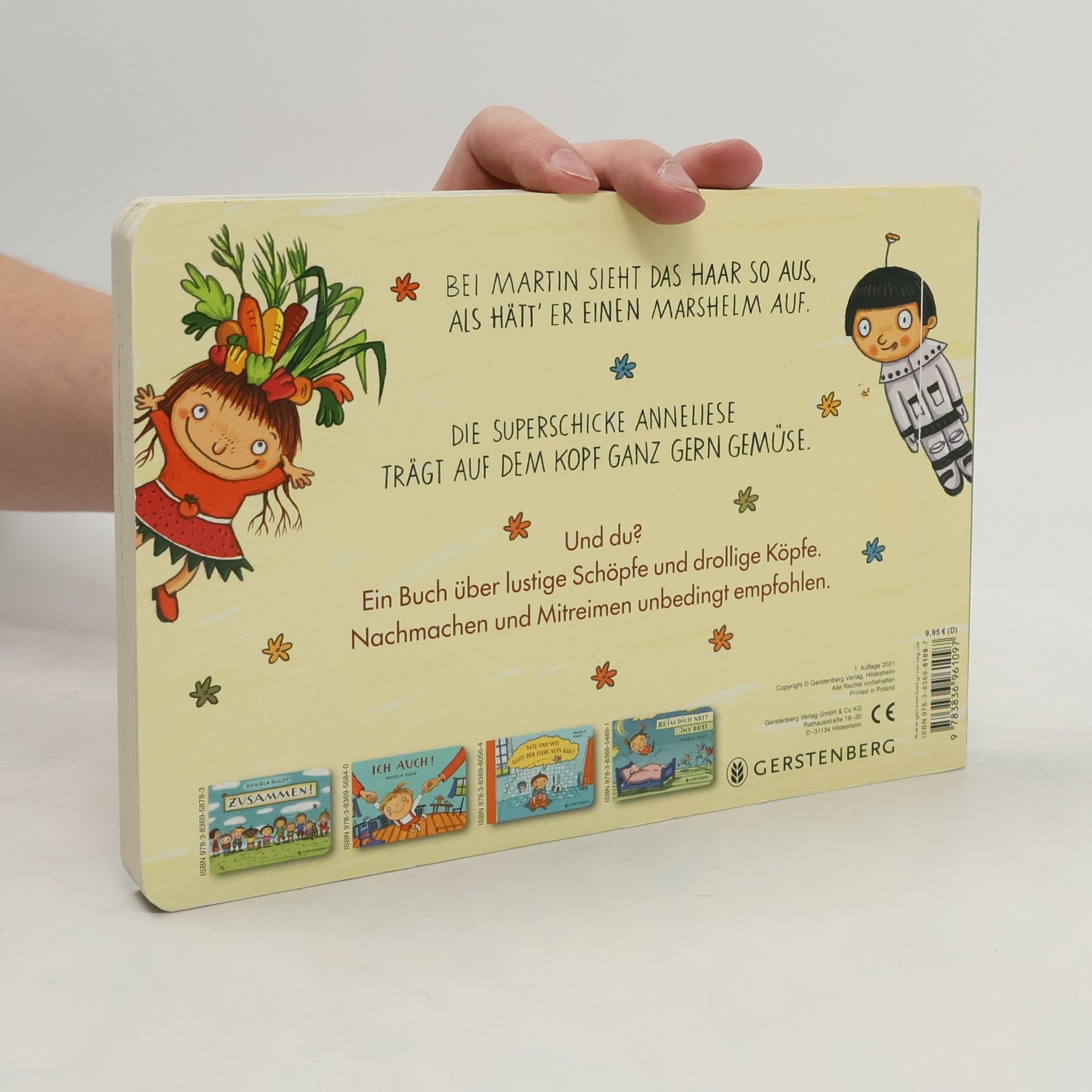 Bei Martin sieht das Haar so aus, als hätt’ er einen Marshelm auf. Die superschicke Anneliese trägt auf dem Kopf ganz gern Gemüse. Und du? Schon kleine Kinder finden es unheimlich spannend, was das Gegenüber so auf dem Kopf hat. Aber ob langes oder kurzes Haar, Pony oder Pferdeschwanz – am Ende zählt doch, was drin ist, im Kopf. Ein augenzwinkerndes Bilderbuch über lustige Schöpfe und drollige Köpfe. Nachmachen und Mitreimen unbedingt empfohlen!