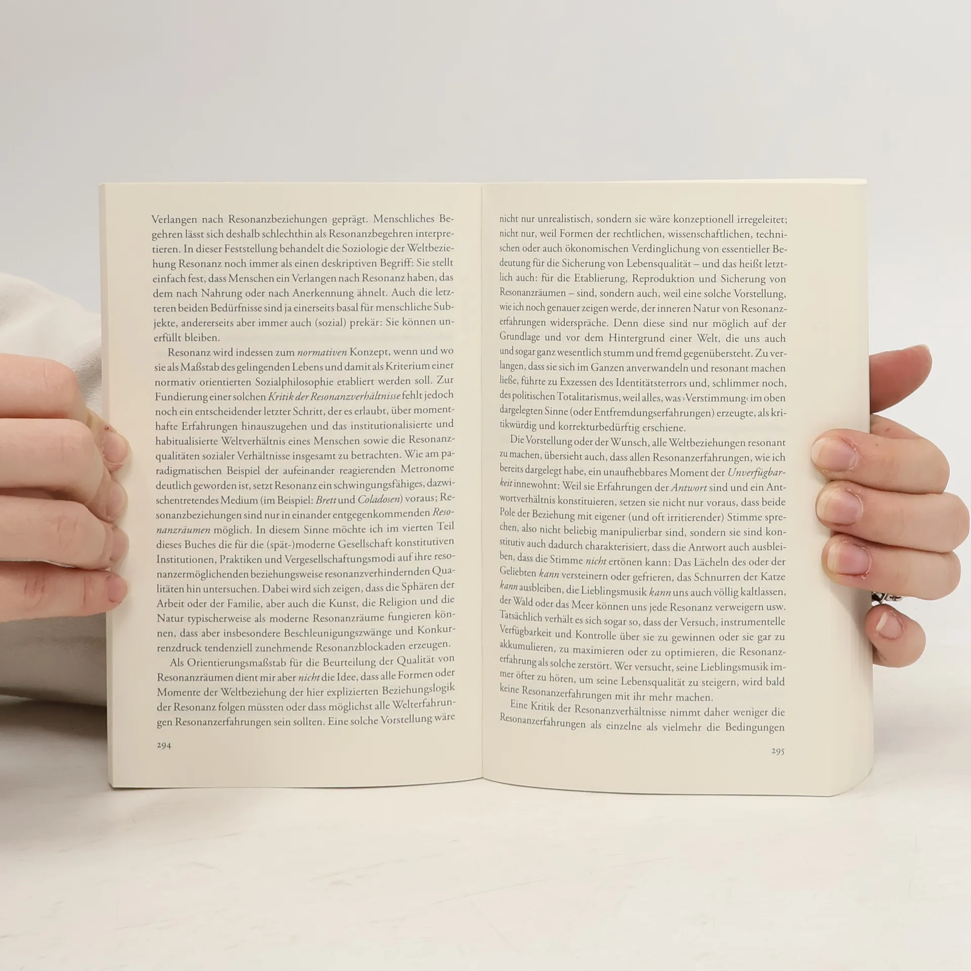 Wenn Beschleunigung das Problem ist, könnte Resonanz die Lösung sein. Dies ist die Kernthese von Hartmut Rosas neuem Werk, das als Gründungsdokument einer Soziologie des guten Lebens betrachtet werden kann. Rosa argumentiert, dass die Qualität menschlichen Lebens nicht in Ressourcen, Optionen oder Glücksmomenten gemessen werden kann. Stattdessen sollten wir die Beziehung zur Welt in den Fokus rücken, die ein Leben prägt und, wenn intakt, stabile Resonanzverhältnisse ausdrückt. Er untersucht die verschiedenen Formen, in denen wir diese Beziehung herstellen, vom Atmen bis zu komplexen Weltbildern. Anschließend widmet er sich konkreten Erfahrungs- und Handlungssphären wie Familie, Politik, Arbeit, Sport, Religion und Kunst, in denen wir Resonanz suchen, jedoch zunehmend Schwierigkeiten haben, sie zu finden. Dies hängt eng mit der Steigerungslogik der Moderne zusammen, die sowohl Ursache als auch Folge einer gestörten Weltbeziehung ist, sowohl individuell als auch kollektiv. Rosa analysiert auch die großen Krisentendenzen der Gegenwartsgesellschaft – Ökokrise, Demokratiekrise, Psychokrise – aus einer resonanztheoretischen Perspektive. Seine umfassende Rekonstruktion der Moderne in Bezug auf historisch realisierte Resonanzverhältnisse versucht, den Rahmen für eine erneuerte Kritische Theorie abzustecken.