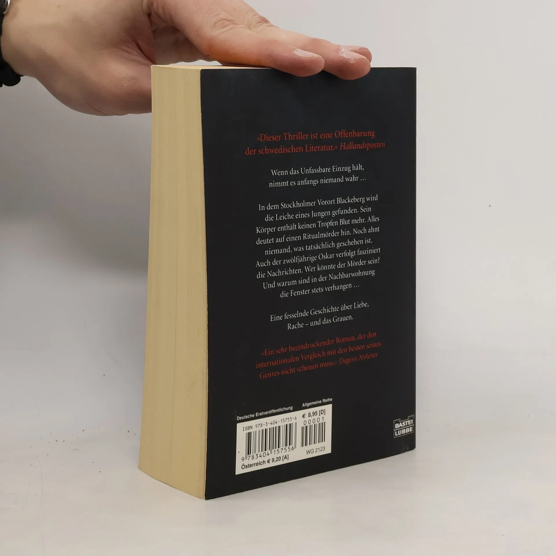 Wenn das Unfassbare Einzug hält, nimmt es anfangs niemand wahr ... In dem Stockholmer Vorort Blackeberg wird die Leiche eines Jungen gefunden. Sein Körper enthält keinen Tropfen Blut mehr. Alles deutet auf einen Ritualmörder hin. Noch ahnt niemand, was tatsächlich geschehen ist. Auch der zwölfjährige Oskar verfolgt fasziniert die Nachrichten. Wer könnte der Mörder sein? Und warum sind in der Nachbarwohnung die Fenster stets verhangen ... Eine fesselnde Geschichte über Liebe, Rache - und das Grauen.