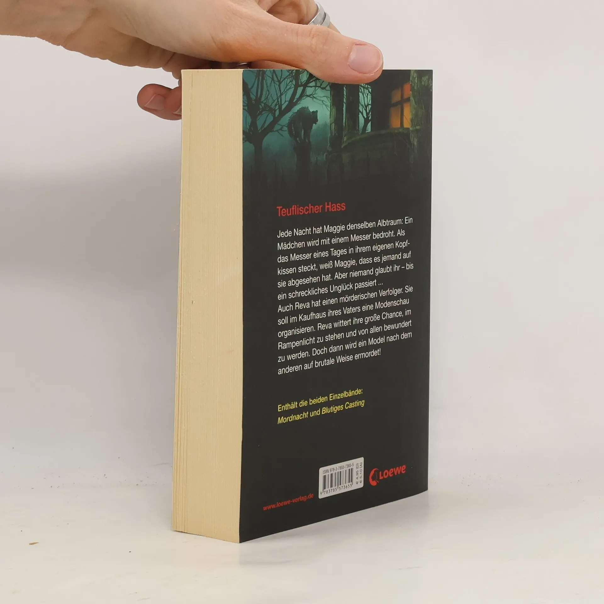 Jede Nacht hat Maggie denselben Albtraum: Ein Mädchen wird mit einem Messer bedroht. Als das Messer eines Tages in ihrem eigenen Kopfkissen steckt, weiß Maggie, dass es jemand auf sie abgesehen hat. Aber niemand glaubt ihr - bis ein schreckliches Unglück passiert. Auch Reva hat einen mörderischen Verfolger. Sie soll im Kaufhaus ihres Vaters eine Modenschau organisieren. Reva wittert ihre große Chance, im Rampenlicht zu stehen und von allen bewundert zu werden. Doch dann wird ein Models nach dem anderen auf brutale Weise ermordet! Enthält die beiden Einzelbände „Mordnacht“ und „Blutiges Casting“