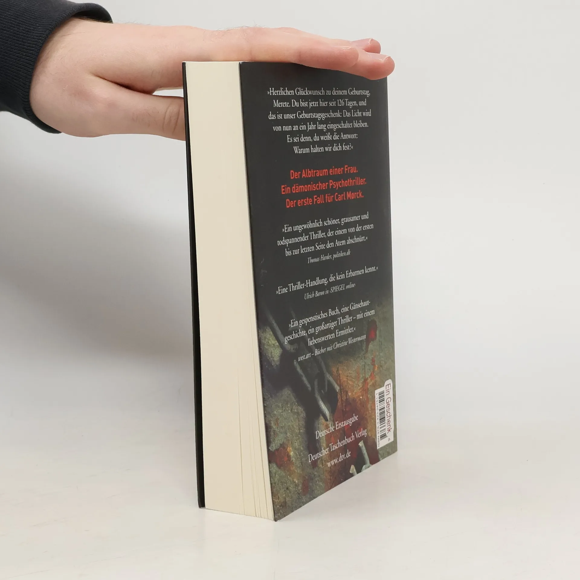 Und dann kam die Angst wie ein schleichendes Gift. Der Albtraum einer Frau.Ein dämonischer Psychothriller.Der erste Fall für Carl Mørckvom Sonderdezernat Q in Kopenhagen. Die verzerrte Stimme kam aus einem Lautsprecher irgendwo im Dunklen: »Herzlichen Glückwunsch zu deinem Geburtstag, Merete. Du bist jetzt hier seit 126 Tagen, und das ist unser Geburtstagsgeschenk: Das Licht wird von nun an ein Jahr lang eingeschaltet bleiben. Es sei denn, du weißt die Antwort: Warum halten wir dich fest?« Am 2. März 2002 verschwindet eine Frau spurlos auf der Fähre von Rødby nach Puttgarden, man vermutet Tod durch Ertrinken. Doch sie ist nicht tot, sondern wird in einem Gefängnis aus Beton gefangen gehalten. Wer sind die Täter? Was wollen sie von dieser Frau? Und: Kann ein Mensch ein solches Martyrium überleben? ››Ein ungewöhnlich schöner und hochspannender Thriller, der einem bis zur letzten Seite den Atem abschnürt.‹‹ politiken. dk Trailer ansehen auf www. adler-olsen. de