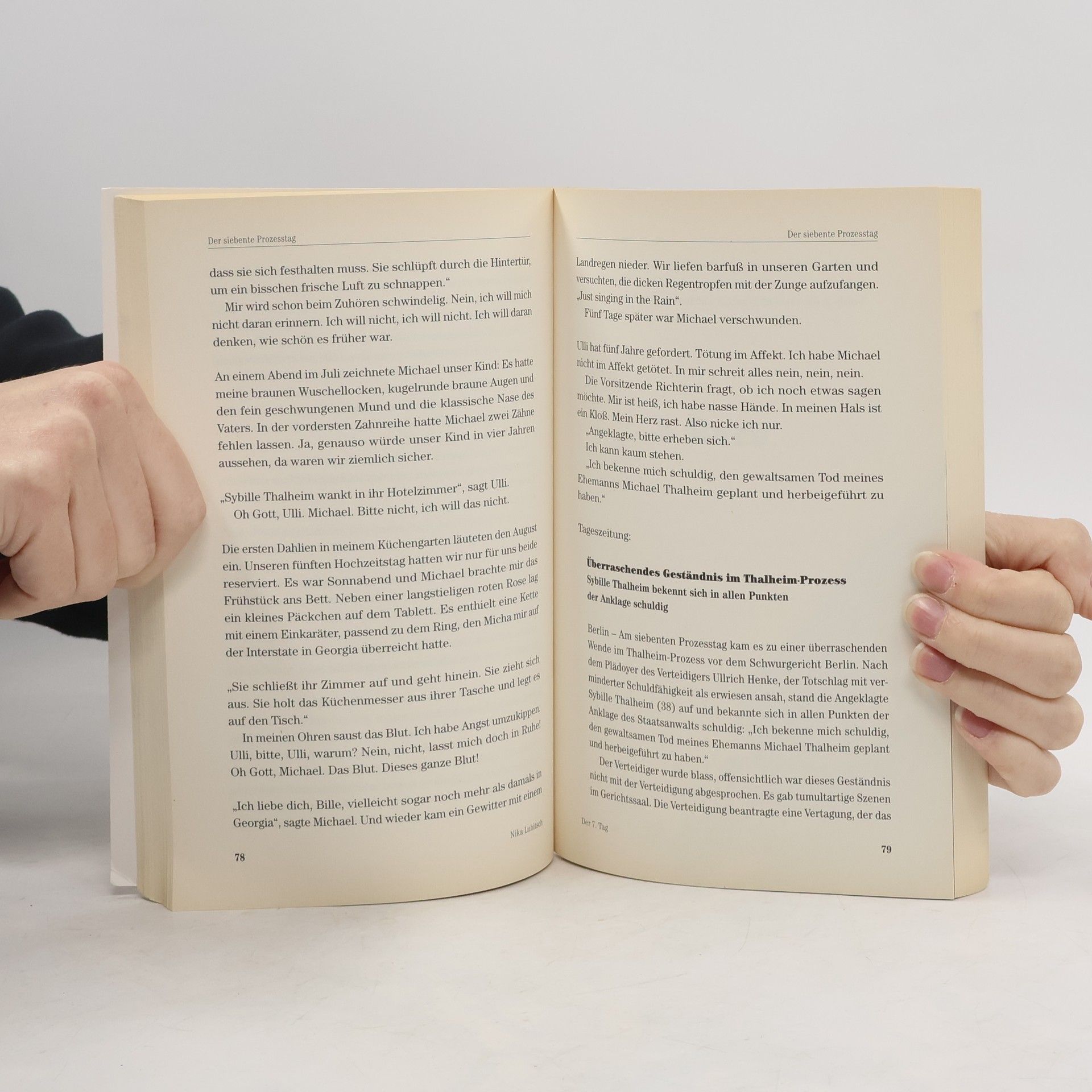 Sybille und Michael sind ein glückliches Paar. Jetzt erwarten sie endlich ihr erstes Kind. Da verschwindet Michael spurlos. Für Sybille beginnt ein Alptraum, aus dem es kein Erwachen gibt. Als Michael nach zwei Jahren tot in einem Hotelzimmer aufgefunden wird, wird Sybille blutbeschmiert mit der Tatwaffe verhaftet. An die Tat kann sie sich nicht erinnern. Kann sie oder will sie nicht? Während Sybille vor Gericht den Ausführungen der Zeugen zuhört, zieht ihr Leben mit Michael an ihr vorbei. Am 7. Prozesstag erkennt sie endlich die Wahrheit. Sie muss sie nur noch beweisen. Dieser hinterhältige Kriminalroman beleuchtet den Tod eines Rechtsanwalts aus verschiedenen Perspektiven, die immer neue Wendungen der Geschichte bringen. Nika Lubitsch weiß, wie man Leser in den Bann zieht.