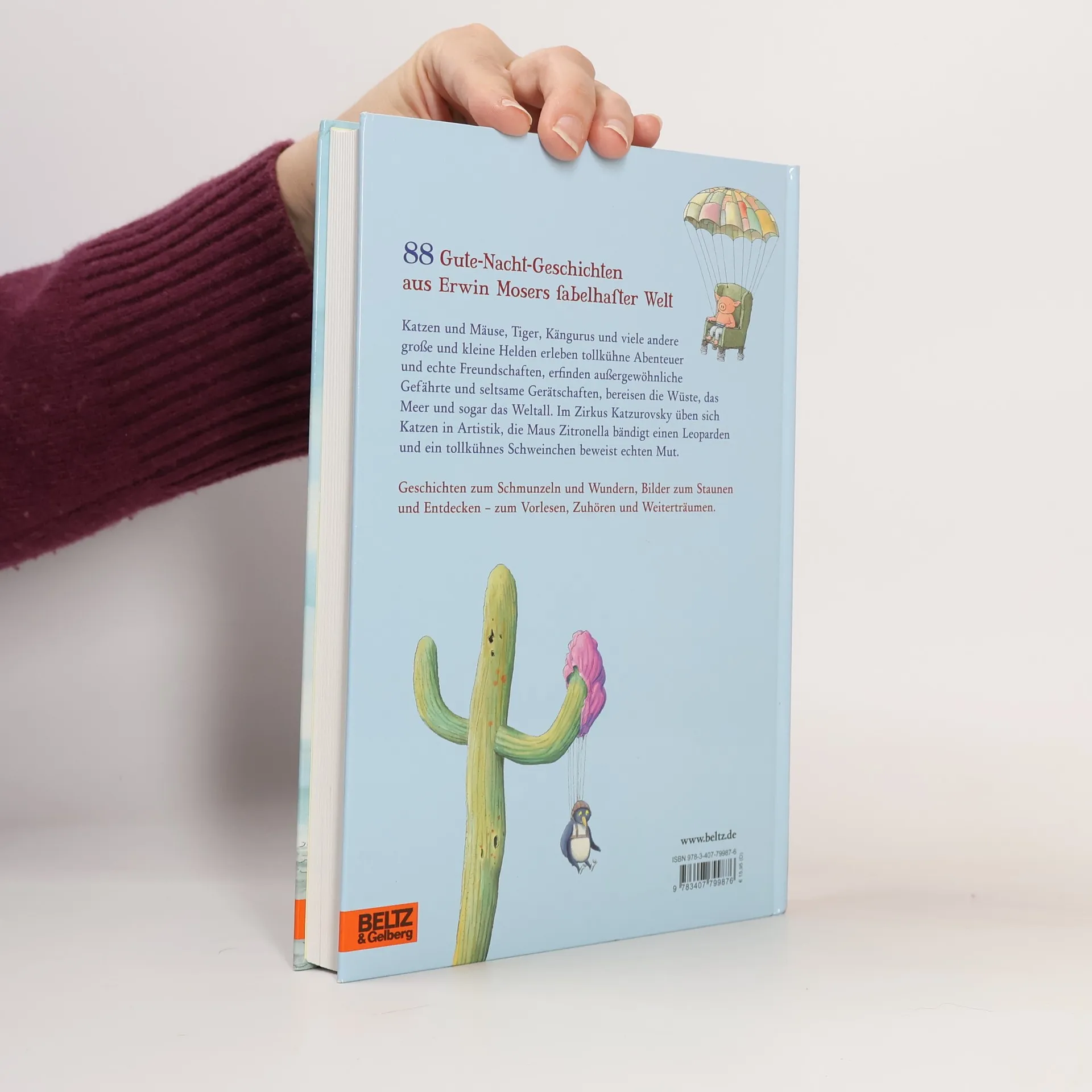 Große Fabulierkunst für die Kleinen: Die schönsten Gute-Nacht-Geschichten für Frühling, Sommer, Herbst und Winter. Opulent bebildert mit einer ganzseitigen Illustration zu jeder Geschichte - zum Vorlesen, Zuhören und Weiterträumen. Acht Kater balancieren im Zirkus Katzurovsky auf Ball, Nudelwalker und Flasche. Das Teekannenauto von Mäusemechaniker Sigurd düst über die Straßen und kocht dabei Tee. Ein rosarotes Zebra, ein violetter Koalabär und ein Leopardenhase reisen übers Meer. Erwin Mosers tierische Helden erleben tollkühne Abenteuer und echte Freundschaften, erfinden außergewöhnliche Gefährte und seltsame Gerätschaften. Trotz aller Abenteuer schaffen die liebevoll erzählten Geschichten und detailreichen Illustrationen eine geborgene Stimmung, in der Kinder beruhigt einschlafen können. »Harmonie und Gemütlichkeit bestimmen diese frei fabulierte Welt, die in den Illustrationen ihre Entsprechung findet. Ideale Geschichten als Betthupferl!« Der Standard, Wien