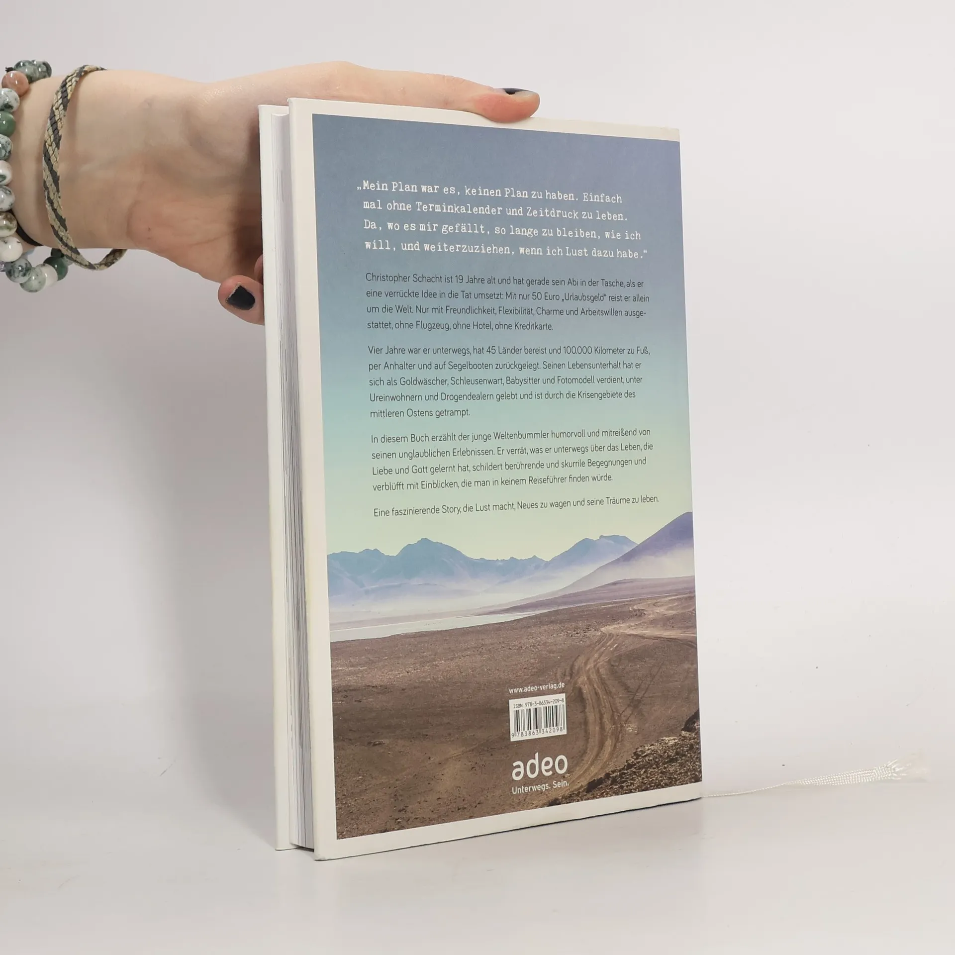 Christopher Schacht ist erst 19 Jahre alt und hat gerade sein Abi in der Tasche, als er eine verrückte Idee in die Tat umsetzt: Mit nur 50 Euro „Urlaubsgeld“ reist er allein um die Welt. Nur mit Freundlichkeit, Flexibilität, Charme und Arbeitswillen ausgestattet, ohne Flugzeug, ohne Hotel, ohne Kreditkarte. Vier Jahre war er unterwegs, hat 45 Länder bereist und 100.000 Kilometer zu Fuß, per Anhalter und auf Segelbooten zurückgelegt. Seinen Lebensunterhalt hat er sich als Goldwäscher, Schleusenwart, Babysitter und Fotomodell verdient, unter Ureinwohnern und Drogendealern gelebt und ist durch die Krisengebiete des mittleren Ostens getrampt. In diesem Buch erzählt der junge Weltenbummler auf humorvolle und mitreißende Art von seinen unglaublichen Erlebnissen. Er verrät, was er unterwegs über das Leben, die Liebe und Gott gelernt hat, schildert berührende und skurrile Begegnungen und verblüfft mit Einblicken, die man in keinem Reiseführer finden würde. Eine faszinierende Story, die Lust macht, Neues zu wagen und seine Träume zu leben!