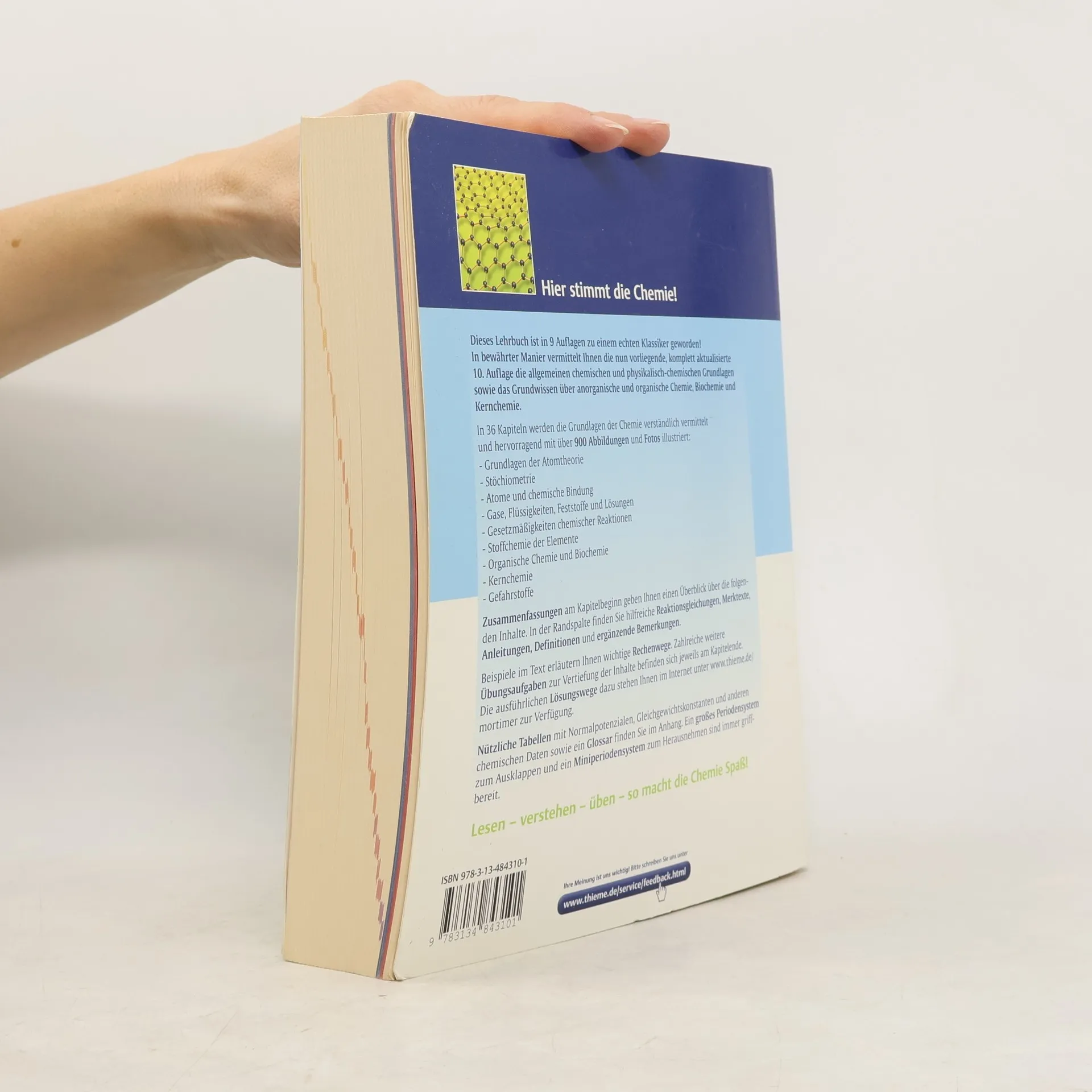 Die gesamte allgemeine und anorganische Chemie jetzt wieder hochaktuell Leicht verständlich und gut lesbar - 35 didaktisch aufbereitete Kapitel zu allgemeiner anorganischer Chemie - Grundwissen der Kernchemie, organischen Chemie und Biochemie - Ein zusätzliches Kapitel zum aktuellen Gefahrstoffrecht - transparent und praxisbezogen Anschaulich und übersichtlich gestaltet: - Komplett vierfarbig - Mit Beispielen zur Veranschaulichung von Rechenverfahren - Übungsaufgaben mit Lösungen zur effizienten Selbstkontrolle und Klausurvorbereitung - Ausführliche Lösungswege im Internet abrufbar - Tabellen mit Normalpotenzialen, Gleichgewichtskonstanten, thermodynamischen Daten und Bindungsenergien im Anhang - Glossar zum Nachschlagen der wichtigsten Begriffe - Ausklappbares Periodensystem und herausnehmbares Miniperiodensystem