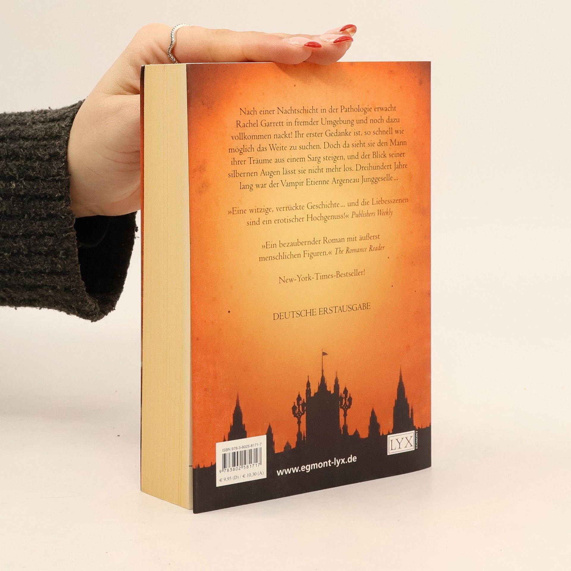 Nach einer Nachtschicht im Leichenschauhaus erwacht Rachel Garrett zu ihrer Überraschung in fremder Umgebung und noch dazu vollkommen nackt! Ihr erster Gedanke ist, so schnell wie möglich das Weite zu suchen. Doch dann sieht sie den Mann ihrer Träume aus einem Sarg steigen, und der Blick in seinen silbernen Augen geht ihr sofort unter die Haut. Dreihundert Jahre lang ist der Vampir Etienne Argeneau Junggeselle gewesen. Die Entscheidung, die hübsche Rachel in eine Vampirin zu verwandeln, wird sein Leben verändern - auf immer und ewig!