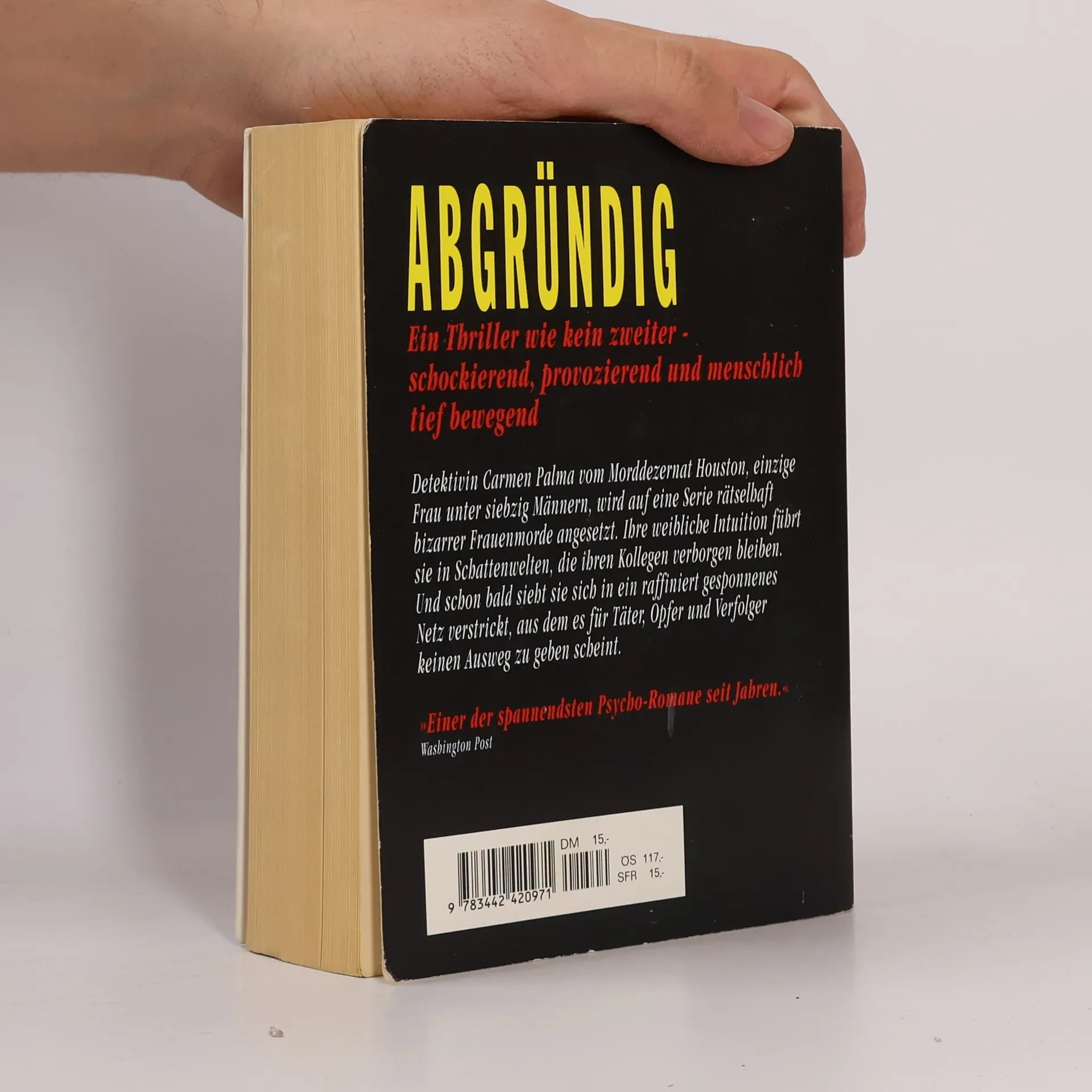 Carmen Palma gehört zum Morddezernat von Houston; sie ist die einzige Frau unter 70 Männern. Als die Stadt von einer Serie mysteriöser Frauenmorde erschüttert wird, setzt man die Detektivin auf diese bizarren Sexverbrechen an. Ihre weibliche Intuition führt sie in einen Kreis von Frauen aus bester Gesellschaft, die alle ein Doppelleben führen. Die Indizien der immer brutaler werdenden Morde fügen sich zu einem Muster zusammen, das jede Erfahrung der Polizei mit psychologischen Profilen von Sexualmördern übersteigt. Carmen Palma wird gezwungen, in Schattenwelten einzutauchen, die auch ihren männlichen Kollegen bisher verborgen geblieben sind. Sie kommt dabei zu einer Erkenntnis, die so schockierend wirkt, daß niemand sie glauben will. Nur der Psychiater Dr. Broussard könnte hier eine Erklärung liefern, da alle Opfer seine Patientinnen waren und mehr. Aber er schweigt. Bis es zu spät ist - für ihn selbst und andere.