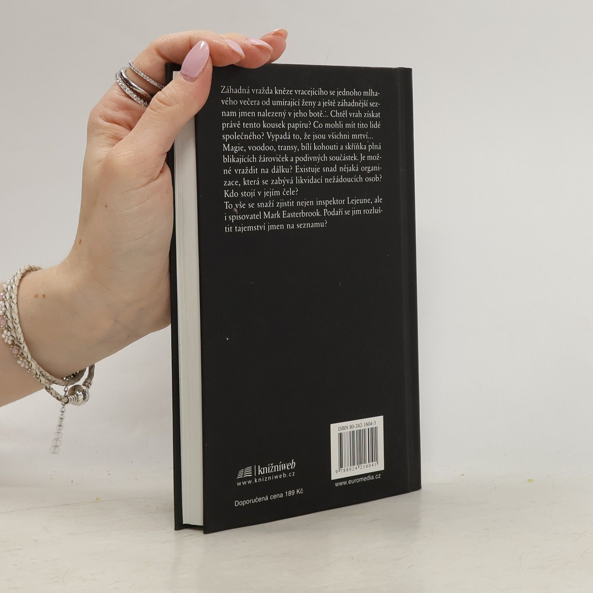 Záhadná vražda kněze vracejícího se jednoho mlhavého večera od umírající ženy a ještě záhadnější seznam jmen nalezený v jeho botě... Chtěl vrah získat právě tento kousek papíru? Co mohli mít tito lidé společného? Vypadá to, že jsou všichni mrtví... Magie, voodoo, transy, bílí kohouti a skříňka plná blikajících žároviček a podivných součástek. Je možné vraždit na dálku? Existuje snad nějaká organizace, která se zabývá likvidací nežádoucích osob? Kdo stojí v jejím čele? To vše se snaží zjistit nejen policejní inspektor Lejeune, ale i spisovatel Mark Easterbrook. Podaří se jim rozluštit tajemství jmen na seznamu?... celý text