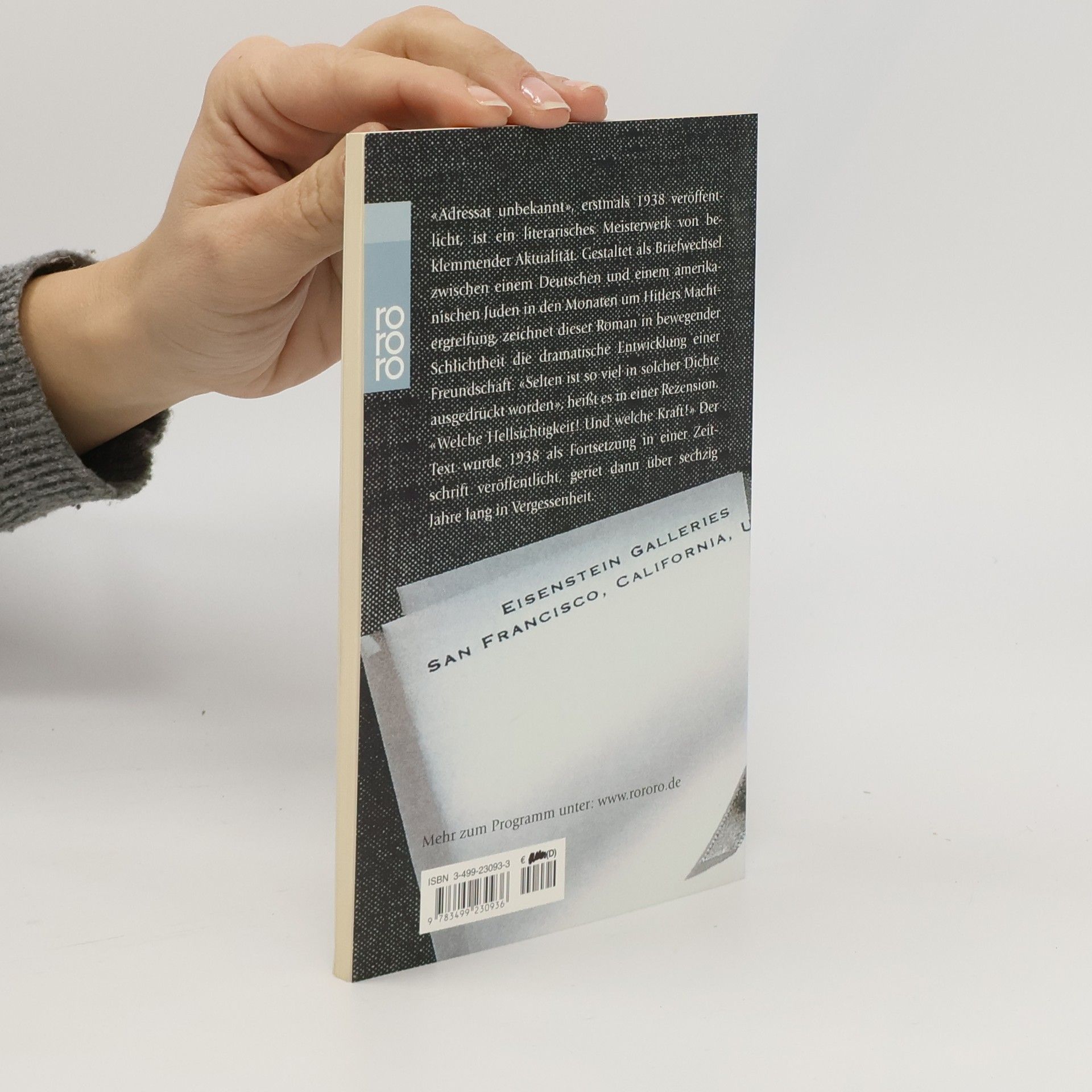 «Adressat unbekannt», erstmals 1938 veröffentlicht, ist ein literarisches Meisterwerk von beklemmender Aktualität. Gestaltet als Briefwechsel zwischen einem Deutschen und einem amerikanischen Juden in den Monaten um Hitlers Machtergreifung, zeichnet dieser Roman in bewegender Schlichtheit die dramatische Entwicklung einer Freundschaft. «Selten ist so viel in solcher Dichte ausgedrückt worden», heißt es in einer Rezension. «Welche Hellsichtigkeit! Und welche Kraft!» Der Text wurde 1938 als Fortsetzung in einer Zeitschrift veröffentlicht, geriet dann über sechzig Jahre lang in Vergessenheit.