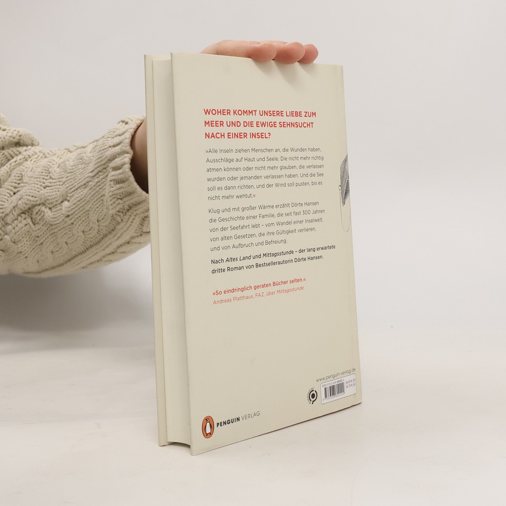 Der dritte Roman von Bestsellerautorin Dörte Hansen. Woher kommt unsere Liebe zum Meer und die ewige Sehnsucht nach einer Insel? Die Fähre braucht vom Festland eine Stunde auf die kleine Nordseeinsel, manchmal länger, je nach Wellengang. Hier lebt in einem der zwei Dörfer seit fast 300 Jahren die Familie Sander. Drei Kinder hat Hanne großgezogen, ihr Mann hat die Familie und die Seefahrt aufgegeben. Nun hat ihr Ältester sein Kapitänspatent verloren, ist gequält von Ahnungen und Flutstatistiken und wartet auf den schwersten aller Stürme. Tochter Eske, die im Seniorenheim Seeleute und Witwen pflegt, fürchtet die Touristenströme mehr als das Wasser, weil mit ihnen die Inselkultur längst zur Folklore verkommt. Nur Henrik, der Jüngste, ist mit sich im Reinen. Er ist der erste Mann in der Familie, den es nie auf ein Schiff gezogen hat, nur immer an den Strand, wo er Treibgut sammelt. Im Laufe eines Jahres verändert sich das Leben der Familie Sander von Grund auf, erst kaum spürbar, dann mit voller Wucht.Klug und mit großer Wärme erzählt Dörte Hansen vom Wandel einer Inselwelt, von alten Gesetzen, die ihre Gültigkeit verlieren, und von Aufbruch und Befreiung.