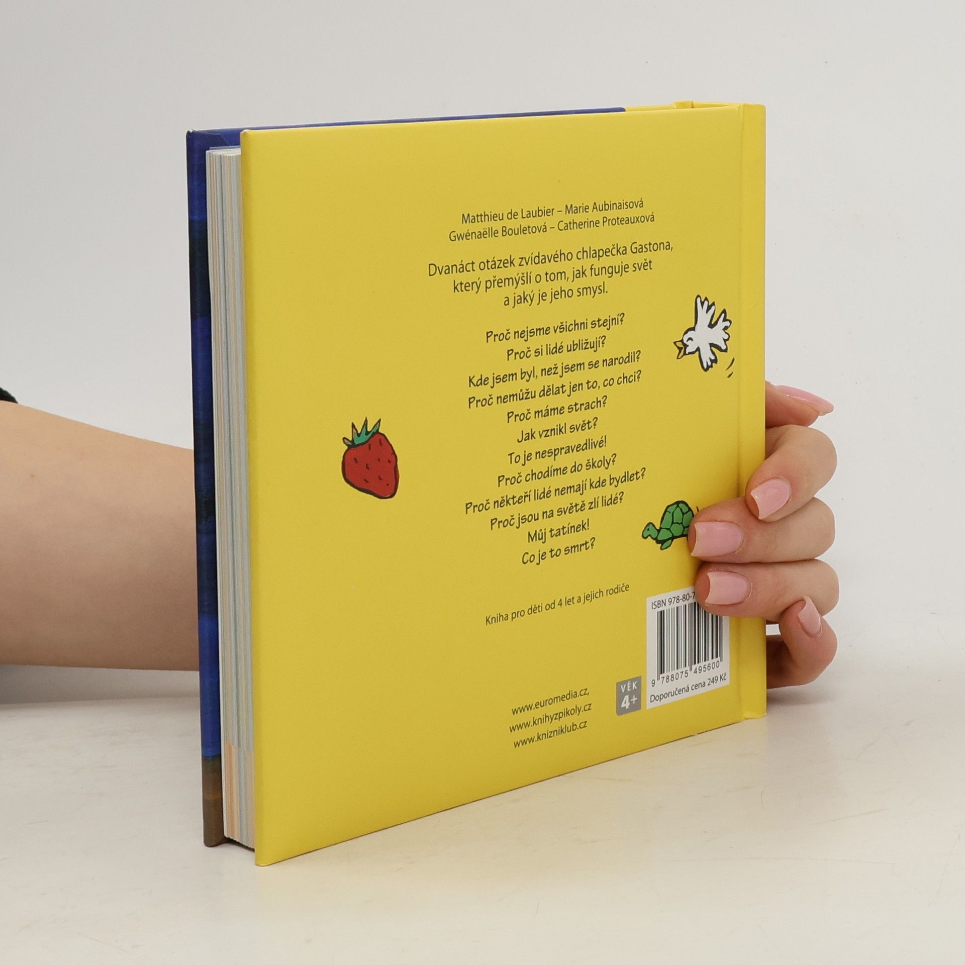 Půvabná knížka plná dynamických ilustrací představuje dvanáct velkých otázek lidské existence, které děti zajímají, když začínají poznávat svět kolem sebe. Gastonovo přemýšlení o okolním světě umožní dětem a jejich rodičům vést nad knížkou vlastní důvěrné rozhovory, a kapitolky pro rodiče v závěru usnadňují dospělým, aby v dialogu se svým dítětem nalezli slova, která uklidní, pomohou a přinesou pokrok ve vývoji.