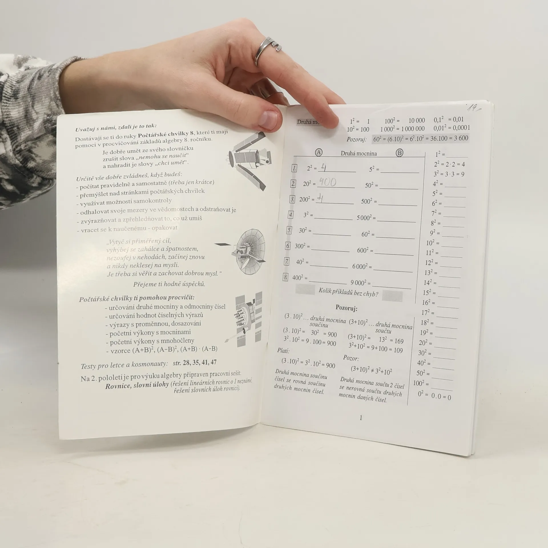 Matematické rozcvičky k procvičení učiva: druhá mocnina a odmocnina, početní výkony s mocninami s přirozeným exponentem, určování hodnot číselných výrazů, sčítání, odčítání a násobení mnohočlenů.