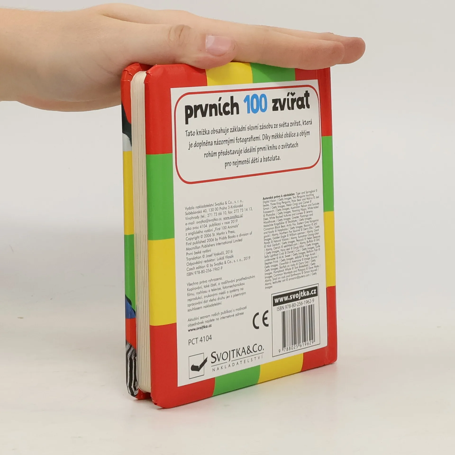 V této knížce určené těm nejmenším "čtenářům", ale především jejich rodičům, kteří mají zájem na rozvíjení slovní zásoby svých dětí, je představeno 100 zvířat na barevných fotografiích s popisky. Měkká obálka a zaoblené rohy umožňují vašim ratolestem pustit se náruživě do "čtení", aniž byste se museli obávat o bezpečnost dětí či stav knihy. Na stránkách najdete přehledně roztříděné názvy zvířat dle několika kategorií – domácí mazlíčci, polární zvířata, zvířata žijící v džungli aj. Kdo to bučí a mečí na statku? Kdopak se to schovává v lese? Naučte dětmi rozpoznávat i zvířata ze vzdálenějších kontinentů – Afriky a Austrálie. V knížce najdete zvířata velká (slon, medvěd, žirafa), ale i ta nejmenší – brouky a hmyz.