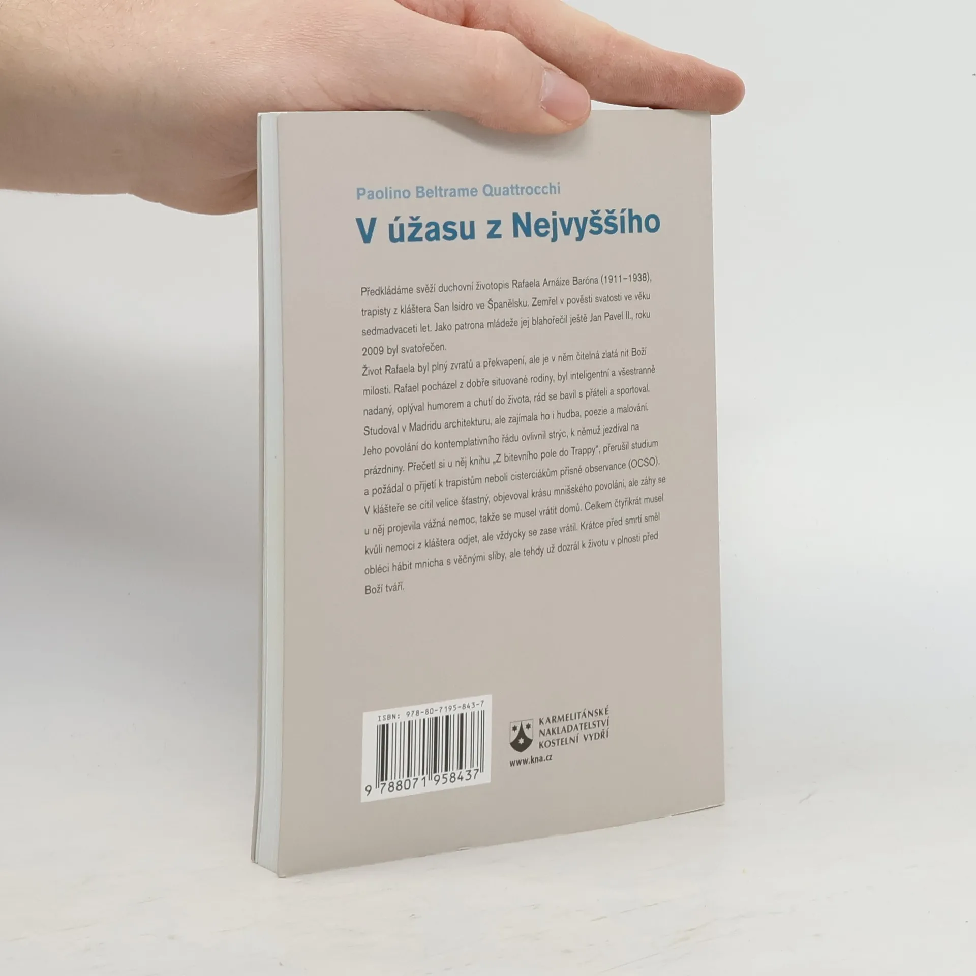 Předkládáme svěží duchovní životopis Rafaela Arnáize Baróna (1911–1938), trapisty z kláštera San Isidro ve Španělsku. Zemřel v pověsti svatosti ve věku sedmadvaceti let. Jako patrona mládeže jej blahořečil ještě Jan Pavel II., roku 2009 byl svatořečen. Život Rafaela byl plný zvratů a překvapení, ale je v něm čitelná zlatá nit Boží milosti. Rafael pocházel z dobře situované rodiny, byl inteligentní a všestranně nadaný, oplýval humorem a chutí do života, rád se bavil s přáteli a sportoval. Studoval v Madridu architekturu, ale zajímala ho i hudba, poezie a malování. Jeho povolání do kontemplativního řádu ovlivnil strýc, k němuž jezdíval na prázdniny. Přečetl si u něj knihu „Z bitevního pole do Trappy“, přerušil studium a požádal o přijetí k trapistům neboli cisterciákům přísné observance (OCSO). V klášteře se cítil velice šťastný, objevoval krásu mnišského povolání, ale záhy se u něj projevila vážná nemoc, takže se musel vrátit domů. Celkem čtyřikrát musel kvůli nemoci z kláštera odjet, ale vždycky se zase vrátil. Krátce před smrtí směl obléci hábit mnicha s věčnými sliby, ale tehdy už dozrál k životu v plnosti před Boží tváří.