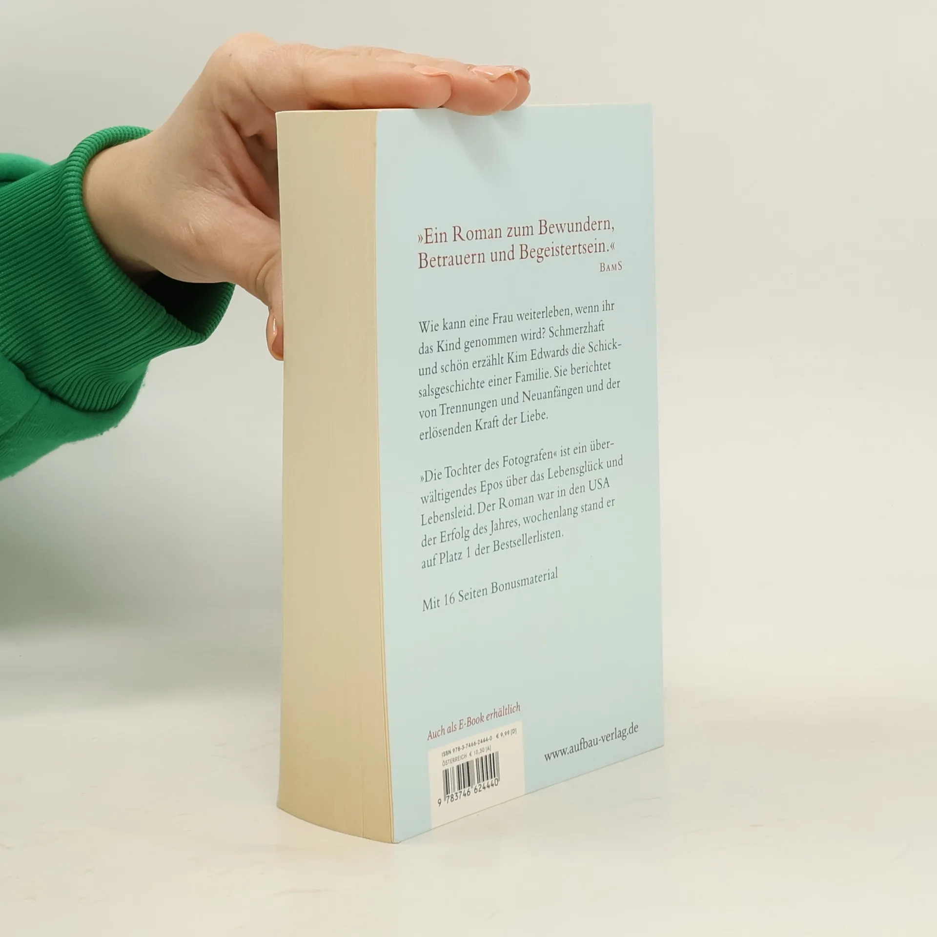„Ein Roman zum Bewundern, Betrauern und Begeistertsein.“ BamS Wie kann eine Frau weiterleben, wenn ihr das Kind genommen wird? Schmerzhaft und schön erzählt Kim Edwards die Schicksalsgeschichte einer Familie. Sie berichtet von Trennungen und Neuanfängen und der erlösenden Kraft der Liebe. „Die Tochter des Fotografen“ ist ein überwältigendes Epos über das Lebensglück und Lebensleid. Der Roman war in den USA der Erfolg des Jahres, wochenlang stand er auf Platz 1 der Bestsellerlisten.