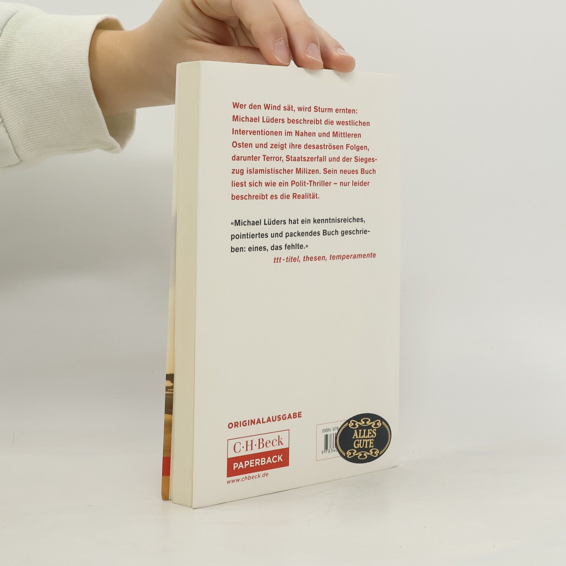 „LIEST SICH WIE EIN POLIT-THRILLER“ BERND SCHEKAUSKI, MDR FIGARO Wer den Wind sät, wird Sturm ernten - Michael Lüders beschreibt die westlichen Interventionen im Nahen und Mittleren Osten seit der Kolonialzeit und erklärt, was sie mit der aktuellen politischen Situation zu tun haben. Sein neues Buch liest sich wie ein Polit-Thriller - nur leider beschreibt es die Realität. Eine Geschichte erscheint in unterschiedlichem Licht, je nachdem, wo man beginnt sie zu erzählen. Und wir sind vergesslich. Das iranische Verhältnis zum Westen versteht nur, wer den von CIA und MI6 eingefädelten Sturz des demokratischen Ministerpräsidenten Mossadegh im Jahr 1953 berücksichtigt. Ohne den Irakkrieg von 2003 und die westliche Politik gegenüber Assad in Syrien lässt sich der Erfolg des „Islamischen Staates“ nicht begreifen. Wer wissen will, wie in der Region alles mit allem zusammenhängt, der greife zu diesem Schwarzbuch der westlichen Politik im Orient. Die verheerenden Folgen westlicher Politik im Orient Geschrieben von einem der besten Kenner