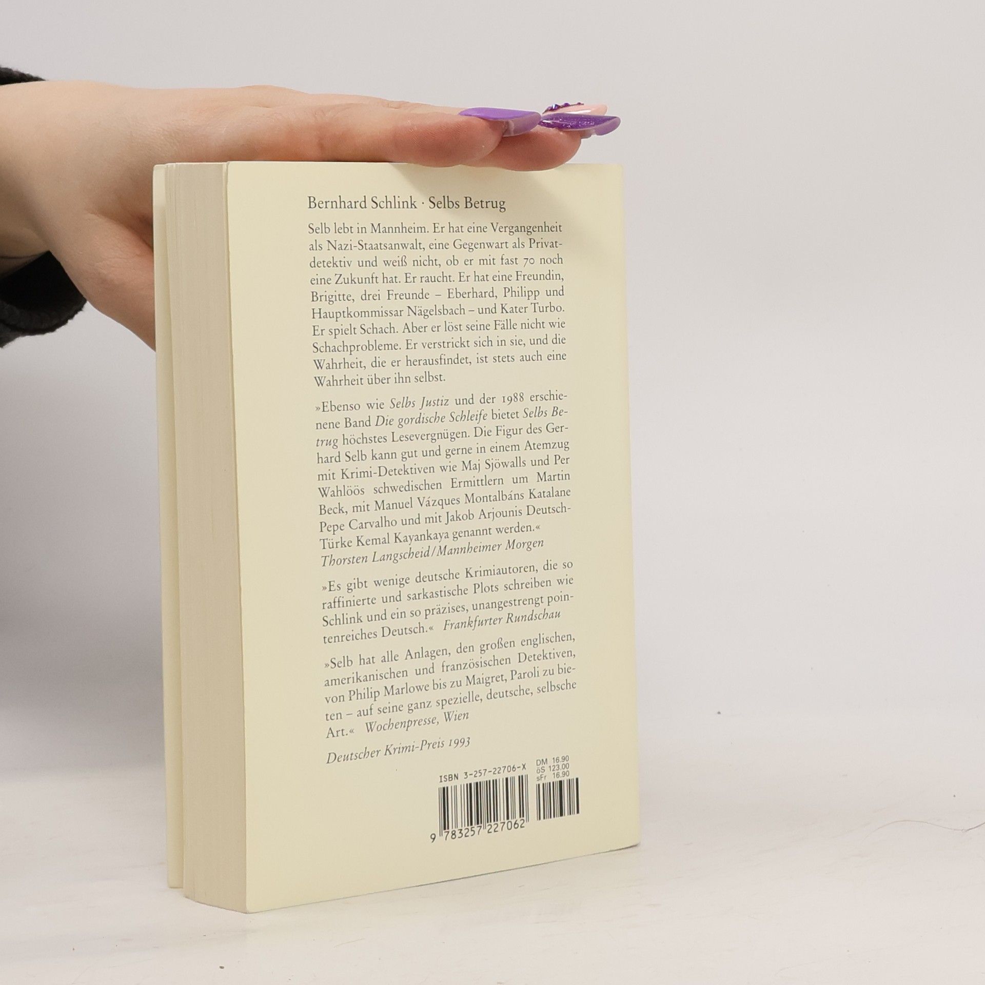 Selb lebt in Mannheim. Er hat eine Vergangenheit als NaziStaatsanwalt, eine Gegenwart als Privatdetektiv und weiß nicht, ob er mit fast 70 Jahren noch eine Zukunft hat. Er raucht. Er hat eine Freundin, Brigitte, und einen Kater, Turbo. Er spielt Schach. Aber er löst seine Fälle nicht wie Schachprobleme. Er verstrickt sich in sie, und die Wahrheit, die er herausfindet, ist stets auch eine Wahrheit über ihn selbst.