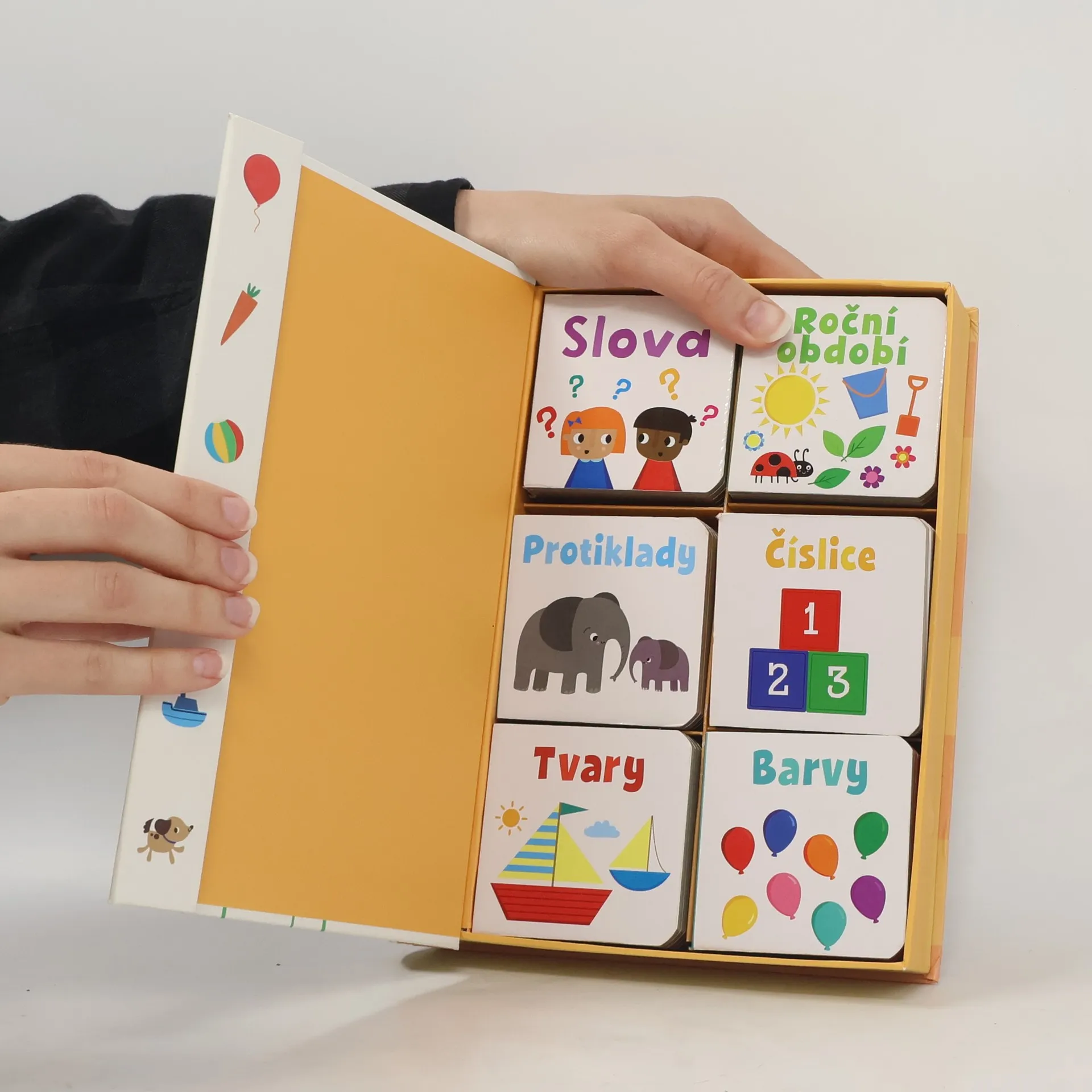 Tato sada obsahuje šest malých roztomilých leporel, pomocí nichž se vaše dítě zábavnou formou naučí barvy, roční období, tvary, protiklady a další slůvka!