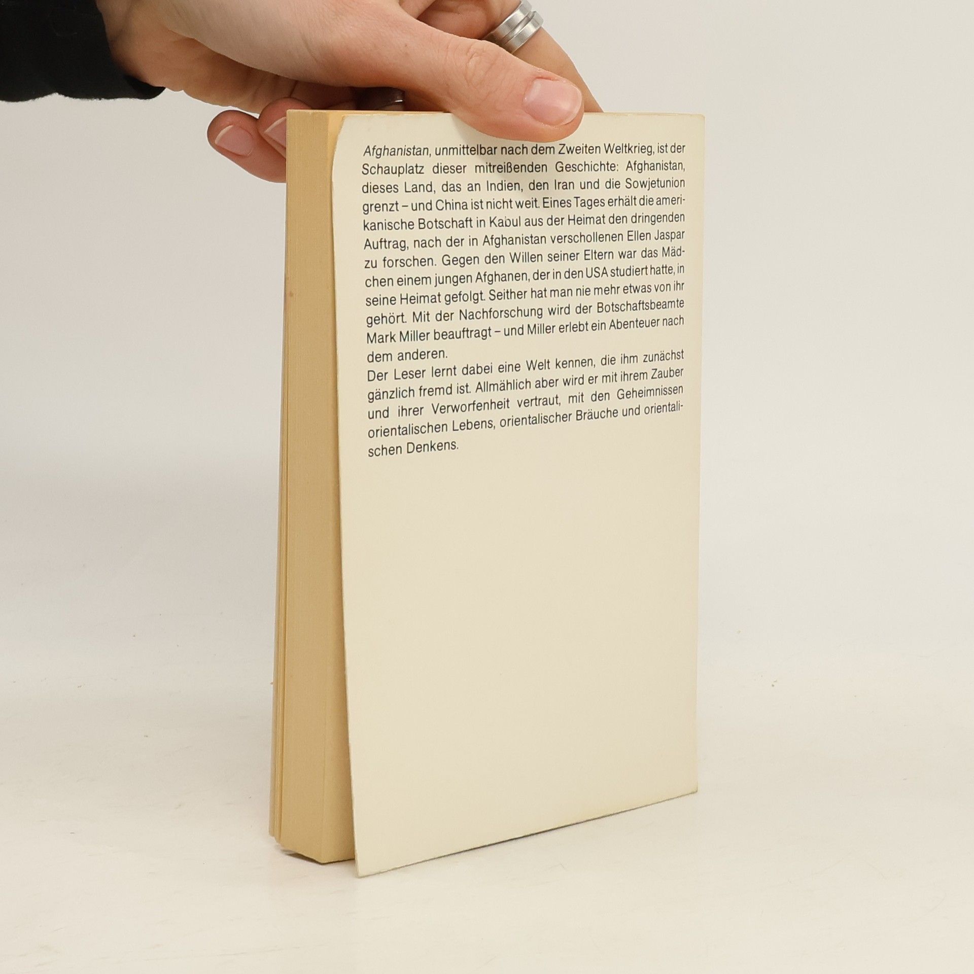 Afghanistan unmittelbar nach dem 2.Weltkrieg, ist der Schauplatz dieser Geschichte. Eines Tages erhält die amerikanische Botschaft in Kabul den dringenden Auftrag, nach der in Afghanistan verschollenen Ellen Jasper zu forschen. Gegen den Willen der Eltern war das junge Mädchen einem jungen Afghanen, der in den USA studierte, in seine Heimat gefolgt.