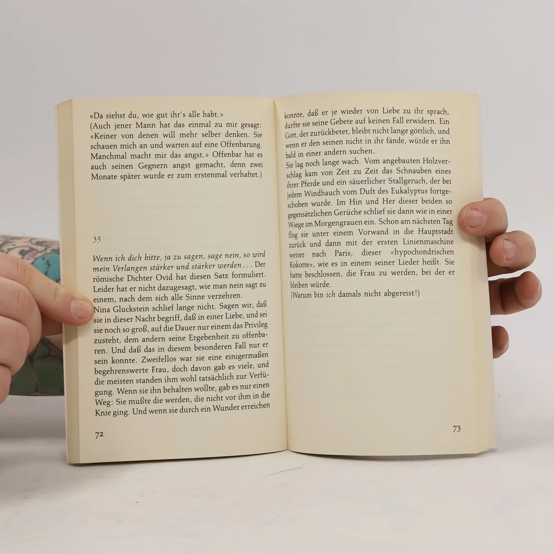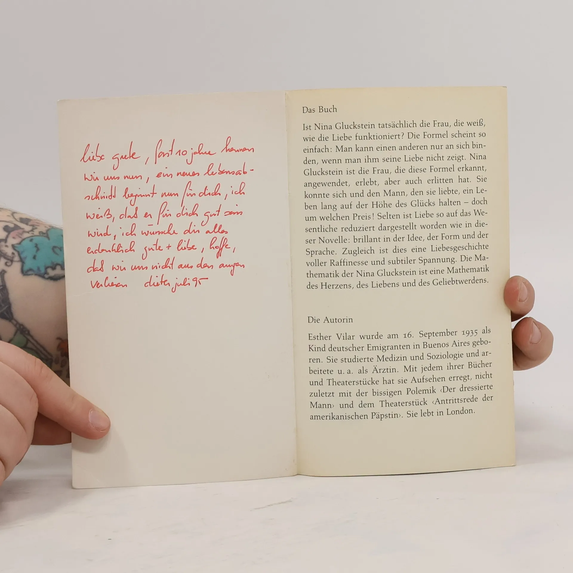 Ist Nina Gluckstein tatsächlich die Frau, die weiß, wie die Liebe «funktioniert»? Die Formel scheint so einfach begreifbar zu sein, ist aber so unendlich schwer zu leben: Es gibt ein sicheres Mittel, einen anderen an sich zu binden – man darf ihm nicht zeigen, daß man ihn an sich binden will. Nina Gluckstein ist die Frau, die diese Formel erkannt, angewendet, erlebt, aber auch erlitten hat. Sie konnte sich und den Mann, den sie liebte, auf der Höhe des Glücks halten – doch um welchen Preis! Selten ist die Liebe so auf das Wesentliche reduziert worden wie in dieser brillanten Novelle: brillant in der Idee, der Form und der Sprache. Zugleich ist dies eine Liebesgeschichte voller Raffinesse und subtiler Spannung. Die Mathematik der Nina Gluckstein ist eine Mathematik des Herzens, des Liebens und Geliebtwerdens. (Dieser Text bezieht sich auf eine frühere Ausgabe.)