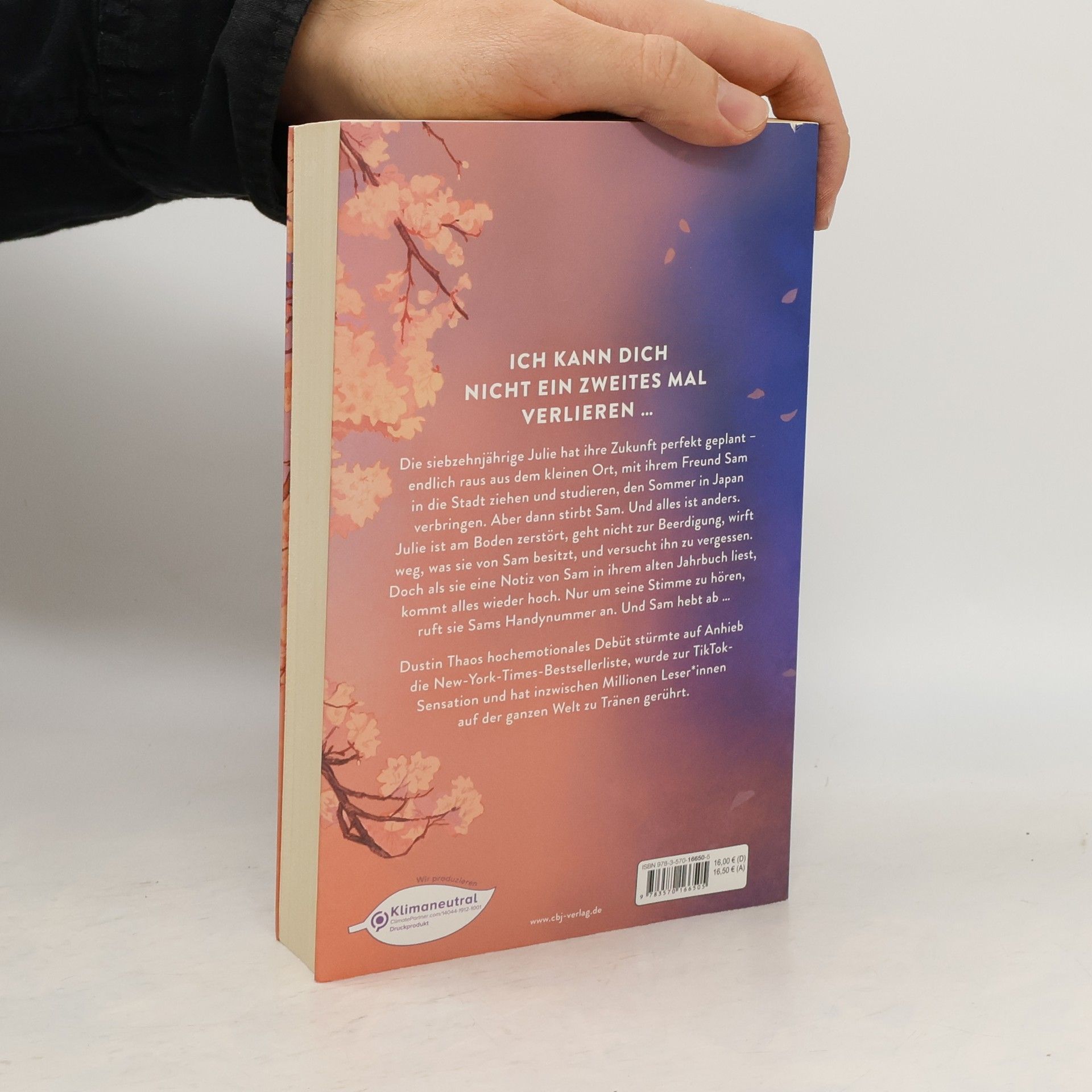 Ich kann dich nicht ein zweites Mal verlieren Die siebzehnjährige Julie hat ihre Zukunft perfekt geplant – endlich raus aus dem kleinen Ort, mit ihrem Freund Sam in die Stadt ziehen und studieren, den Sommer in Japan verbringen. Aber dann stirbt Sam. Und alles ist anders. Julie ist am Boden zerstört, geht nicht zur Beerdigung, wirft weg, was sie von Sam besitzt, und versucht ihn zu vergessen. Doch als sie eine Notiz von Sam in ihrem alten Jahrbuch liest, kommt alles wieder hoch. Nur um seine Stimme zu hören, ruft sie Sams Handynummer an. Und Sam hebt ab … Dustin Thaos hochemotionaler Debütroman über Liebe, Trauer und Verlust stürmte auf Anhieb die New-York-Times-Bestsellerliste, wurde zur TikTok-Sensation und hat inzwischen Millionen Leser*innen auf der ganzen Welt zu Tränen gerührt.