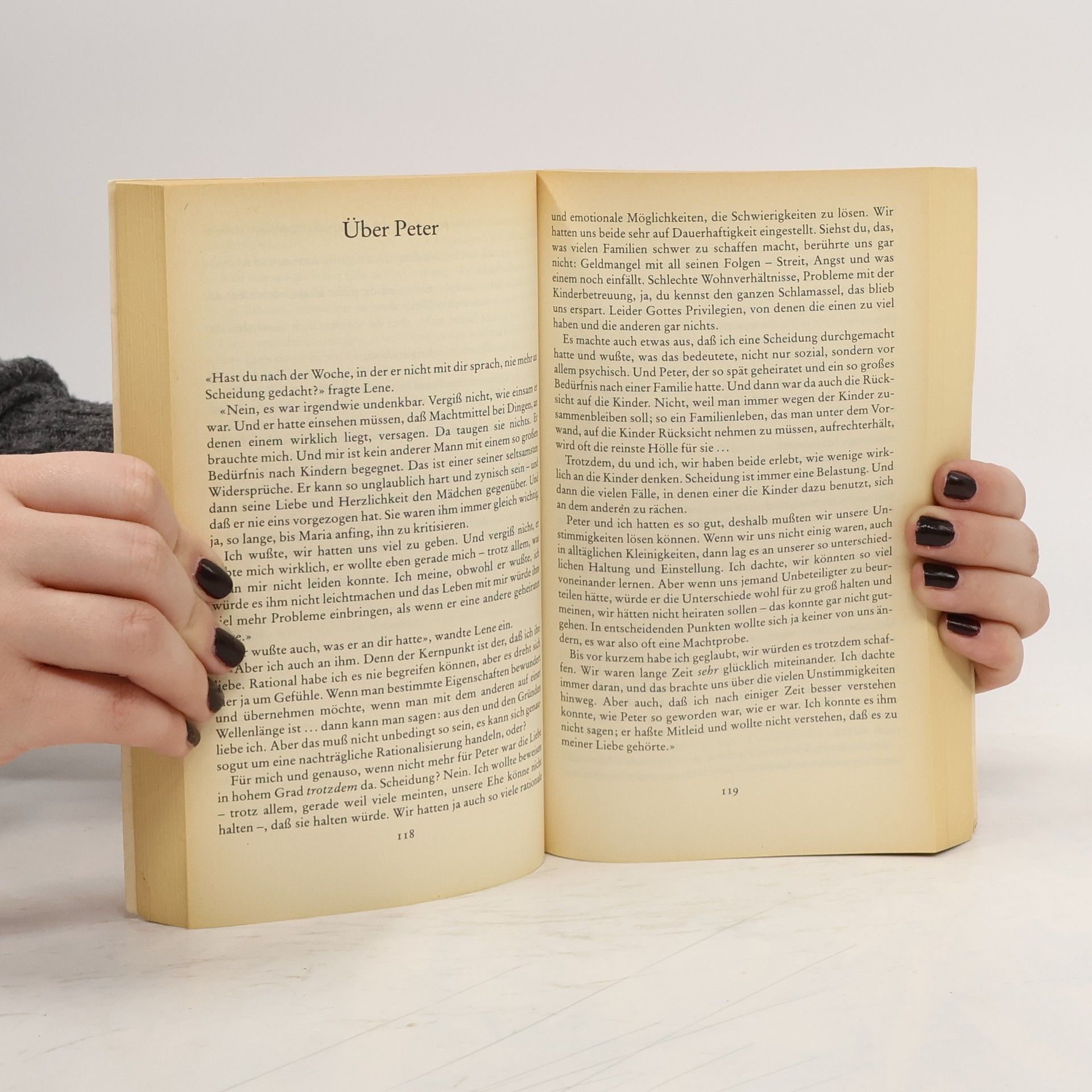 Wie schon in den Romanen «Le und die Knotenmänner» und «Lene» beginnt es Helene, mit dem Rechtsanwalt Peter verheiratet, flieht mit Körperverletzungen zu ihrer Freundin Lene; ihr Mann hat sie zum erstenmal in zwanzig Ehejahren geschlagen. Das Gespräch der beiden Frauen bildet den Rahmen für die Erinnerung an Szenen einer Ehe, wie sie schwieriger kaum denkbar zwischen einem konservativen Patrizier und ehrgeizigen Lokalpolitiker und einer in kleinbürgerlichem Milieu aufgewachsenen, vielfältig sozial engagierten Frau.