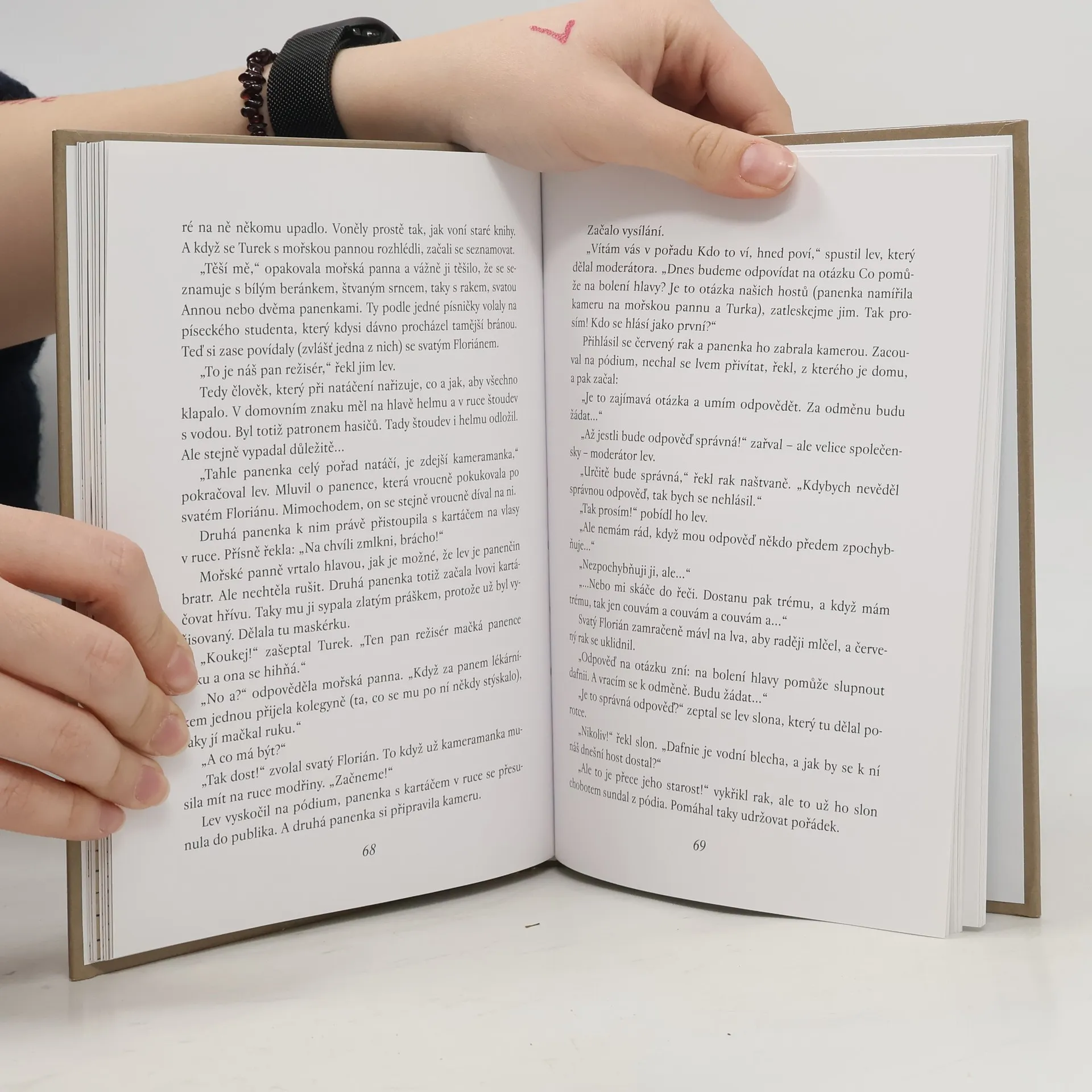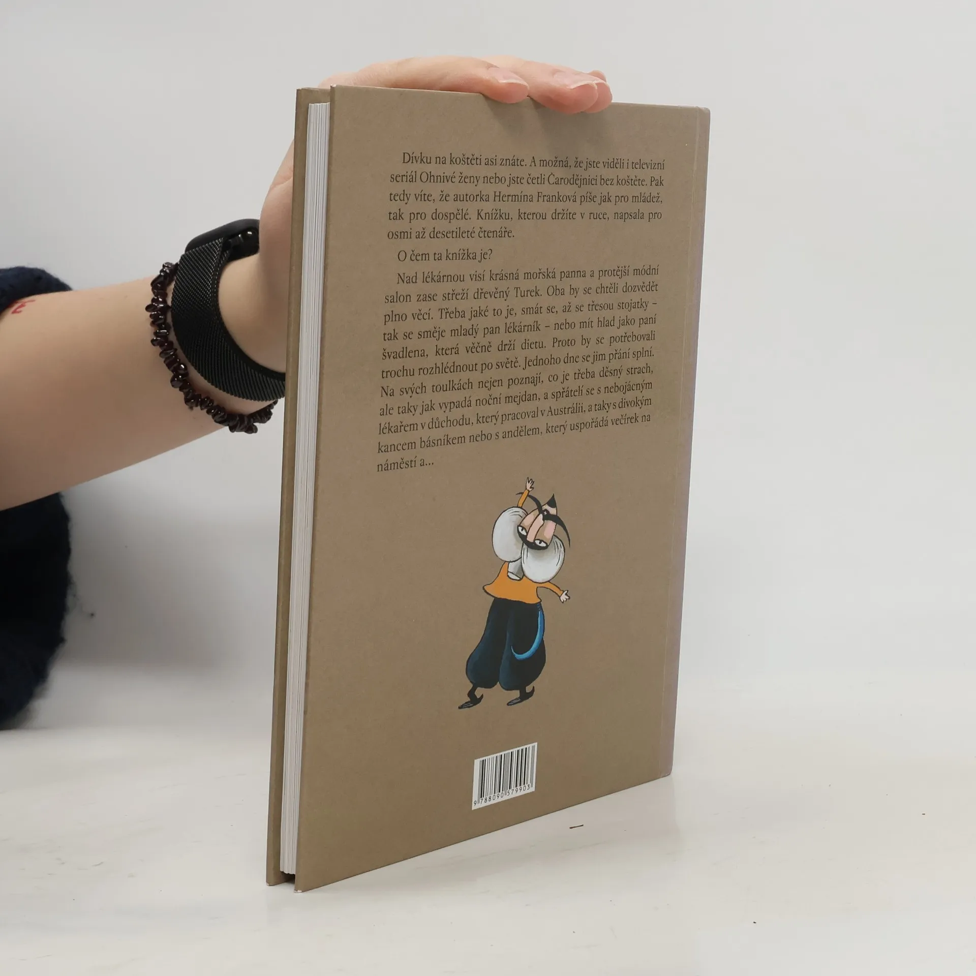 Jupí, jdeme do světa! - Turek a mořská panna na cestách. Dívku na koštěti asi znáte. A možná, že jste viděli i televizní seriál Ohnivé ženy nebo jste četli Čarodějnici bez koštěte. Pak tedy víte, že autorka Hermína Franková píše pro mládež, pro dospělé a nyní i pro osmi až desetileté děti. O čem ta knížka je ? Nad lékárnou visí krásná mořská panna a protější módní salón zase střeží dřevěný Turek. Oba by se chtěli dozvědět plno věci. Třeba jaké to je smát se až se třesou stojatky- tak se směje mladý pan lékárník- nebo mít hlad jako paní švadlena, která věčně drží dietu. Proto by se potřebovali trochu rozhlédnout po světě. Jednoho dne se jim přání splní. Na svých toulkách nejen poznají, co je třeba děsný strach , ale taky jak vypadá noční mejdan a spřátelí se s nebojácným lékařem v důchodu, který pracoval v Austrálii, taky s divokým kancem básníkem nebo s andělem, který uspořádá večírek na náměstí a….