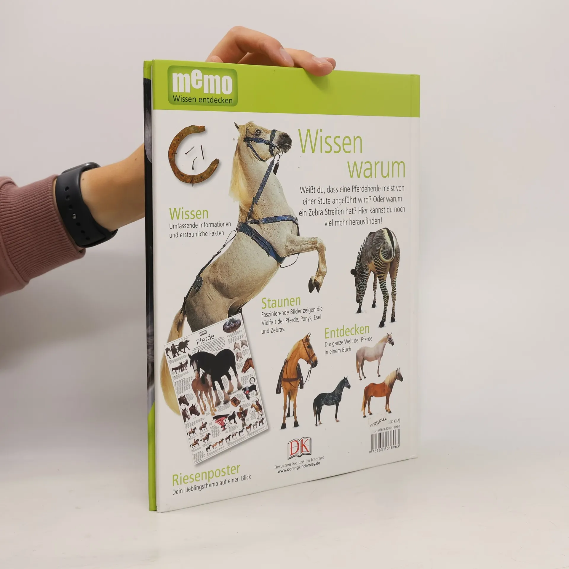 Vor ungefähr 6000 Jahren wurden Pferde erstmals domestiziert. Heute gibt es über 100 Pferderassen. Welche Rassen gibt es? Warum haben Pferde ihre Augen seitlich am Kopf? Wie sprechen Pferde mit ihren Ohren? Und warum hat ein Zebra Streifen? Antworten auf diese und viele weitere Fragen gibt es in Band 43 der neuen großen Wissensreihe memo. Faszinierende Bilder von Pferden, Ponys, Eseln und Zebras kombiniert mit gut gegliederten, kurzen Texten erklären die Thematik leicht verständlich. Auch schwierigere Sachverhalte werden so begreifbar. Bestimmte Rubriken wie „Erstaunliche Fakten“, „Fragen und Antworten“ oder „Rekordverdächtig“ sowie ein umfangreiches Glossar wiederholen das vorher vermittelte Wissen und geben noch einmal einen Überblick. Ideal auch für Referate und Schulprojekte.
