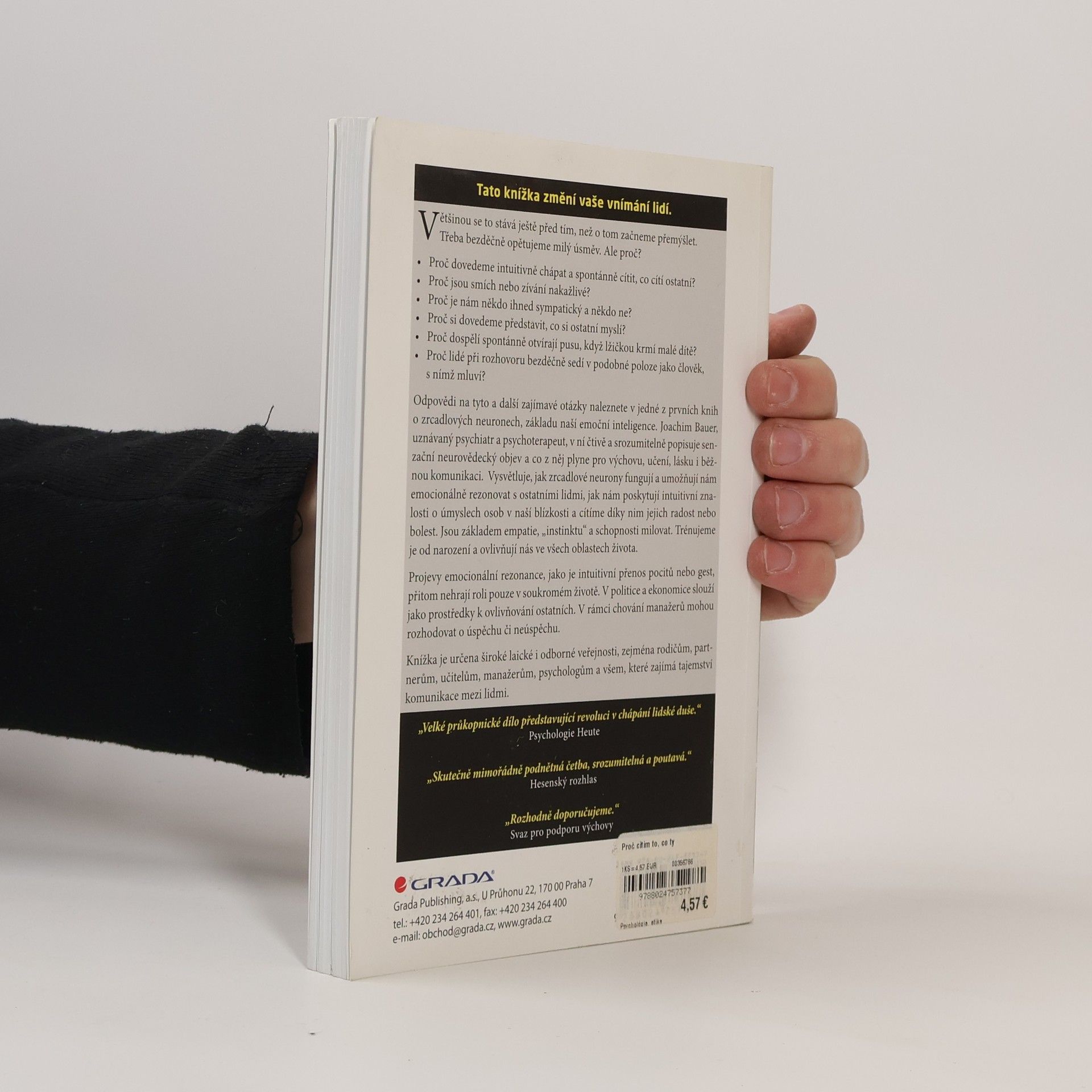 Tato knížka změní vaše vnímání lidí a přináší odpovědi na otázky, které si často ani neklademe. Proč bezděčně opětujeme úsměv? Jak to, že smích nebo zívání jsou nakažlivé? Co určuje naši sympatii k jiným? Proč se dokážeme vcítit do myšlenek ostatních? Joachim Bauer, uznávaný psychiatr a psychoterapeut, se v této knize zaměřuje na zrcadlové neurony, které jsou základem naší emoční inteligence. Srozumitelně popisuje, jak tyto neurony fungují a jak nám umožňují emocionálně rezonovat s ostatními. Díky nim intuitivně chápeme úmysly lidí v našem okolí a sdílíme jejich radosti a bolesti. Zrcadlové neurony jsou klíčové pro empatii a schopnost milovat, trénujeme je od narození a ovlivňují nás ve všech oblastech života. Emocionální rezonance hraje důležitou roli nejen v osobním životě, ale i v politice a ekonomice, kde ovlivňuje rozhodování a úspěch. Kniha je určena široké veřejnosti, včetně rodičů, partnerů, učitelů, manažerů a psychologů, a nabízí cenné poznatky o tajemství komunikace mezi lidmi.