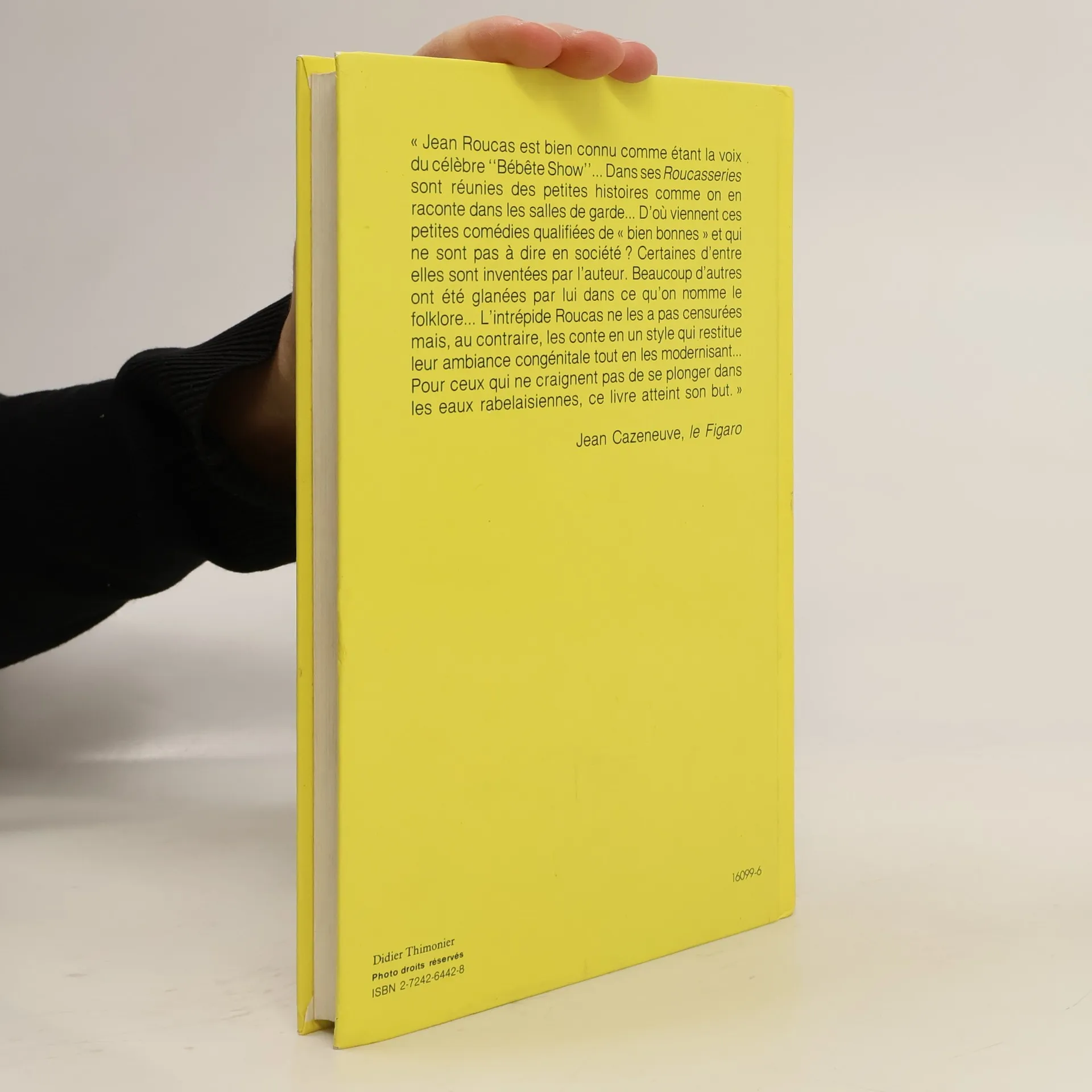 Jean Roucas! Le rire non-stop depuis neuf ans. Chez Félix, au Don Camillo, au Caveau de a République, sur RTL et à la télévision depuis la rencontre choc avec Stéphane Collaro: Collaro-show, Cocoricocoboy et le célèbre Bébêteshow, dont Roucas est l'un des créateurs.Et il "roucasse" toujours sur Europe 1, chaque matin de la semaine de 11h à midi et demie! Là, entre deus rosseries d'actualité, il nous offre en apéritif ces "histoires drôles" ou carrément burlesques, auxquelles le plus pincé des auditeurs ne saurait résiser.Le premier receuil des Roucasseries, paru en novembre 1990, frise aujourd'hui les 400 000 exemplaires.Mais depuis un an, bien sûr, Jean Roucas a renouvelé son stock. Les Nouvelles Roucasseries, cru 1991, nous font retrouver le spersonnages vedettes de l'amuseur public numéro un: Ginette la secrétaire et sa copine Josy, le docteur Jacquot, l'abbé Favier, Madame Grinder et Monsieur Maurice, le savoureux pied-noir, dans un série de situations désopilantes et de gags inédits.De quoi éclairer d'une gaieté fracassante le matinées moroses, détendre les atmosphères guindées, faire pétiller les fins de repas et entretenir la bonne humeur.