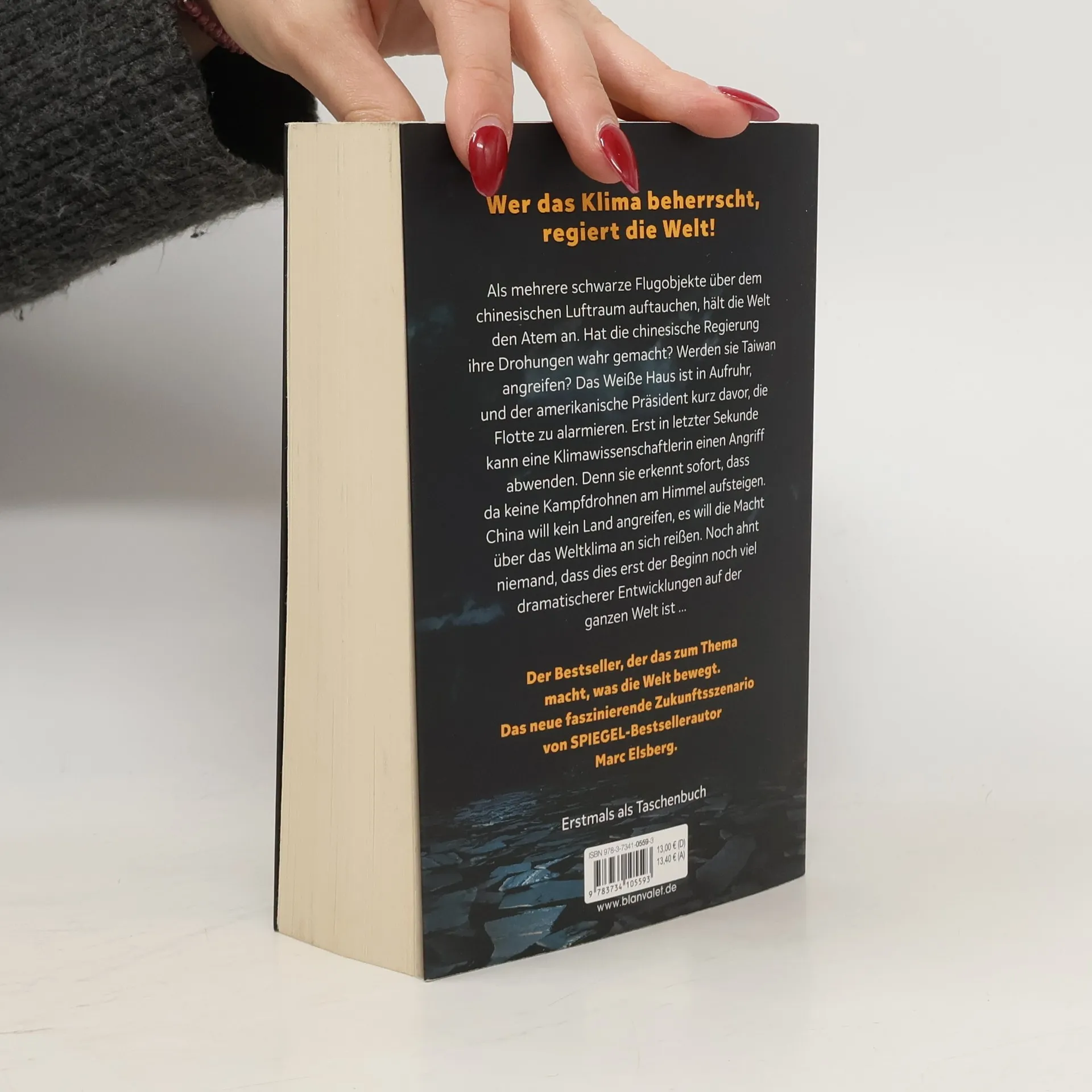 In Marc Elsbergs neuem Taschenbuch beobachten die Welt und das Weiße Haus besorgt schwarze Flugobjekte über China. Eine Klimawissenschaftlerin erkennt, dass es sich nicht um einen militärischen Angriff handelt, sondern um Chinas Bestreben, die Kontrolle über das Weltklima zu erlangen. Dies ist erst der Anfang einer dramatischen Entwicklung.