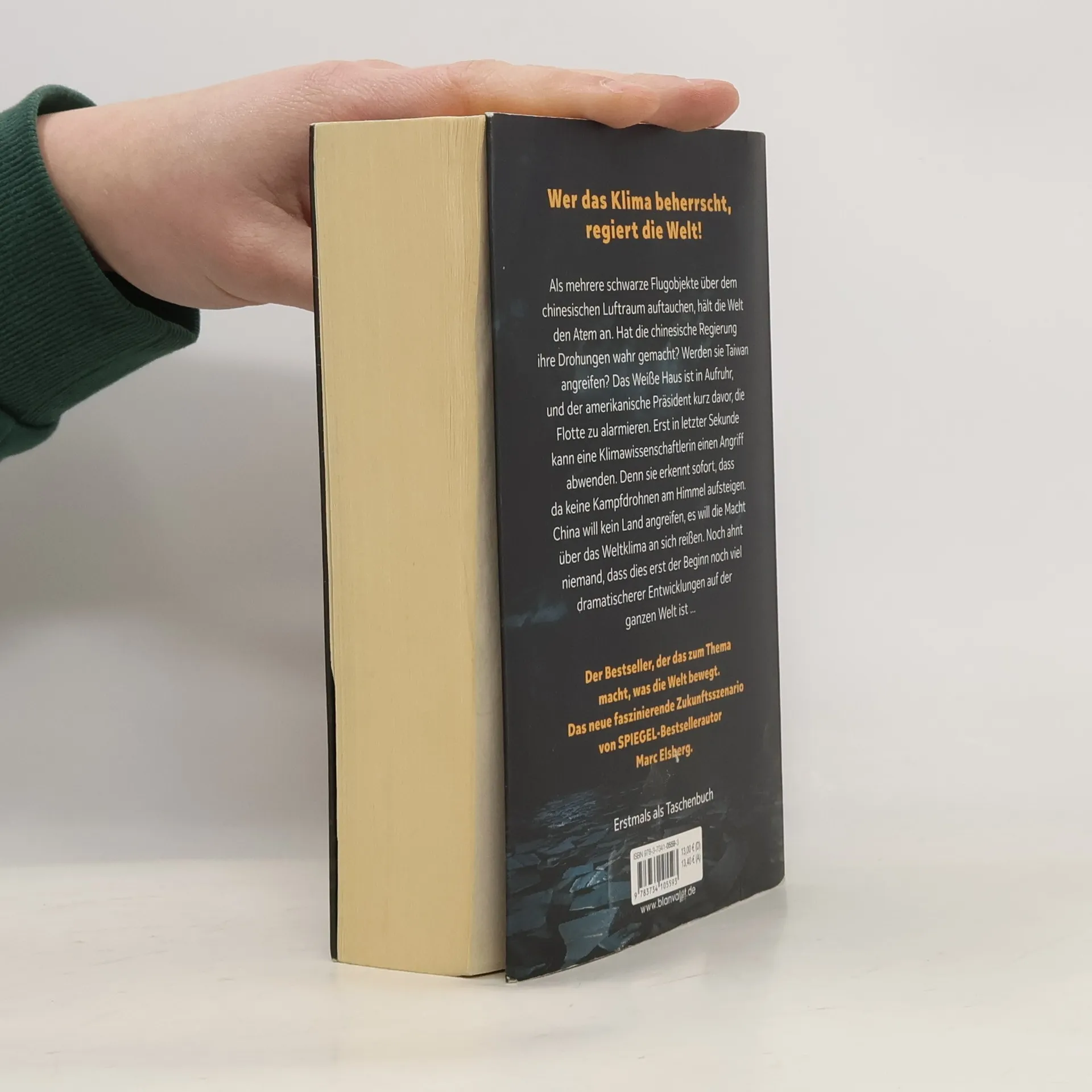 In Marc Elsbergs neuem Taschenbuch beobachten die Welt und das Weiße Haus besorgt schwarze Flugobjekte über China. Eine Klimawissenschaftlerin erkennt, dass es sich nicht um einen militärischen Angriff handelt, sondern um Chinas Bestreben, die Kontrolle über das Weltklima zu erlangen. Dies ist erst der Anfang einer dramatischen Entwicklung.