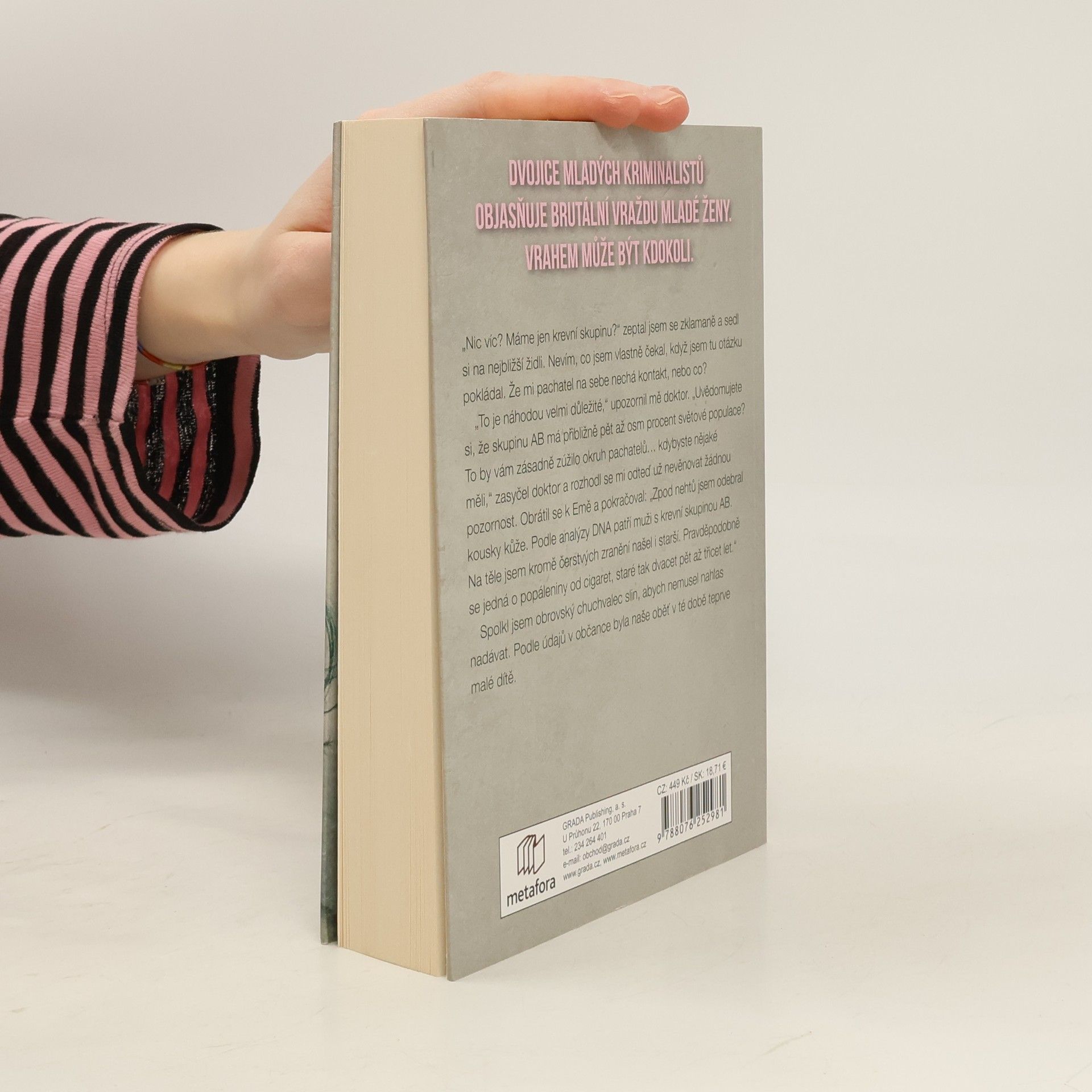 V bohem zapomenuté chatové osadě na východním Slovensku nacházejí dva mladíci zavražděnou ženu. Její totožnost je velkou neznámou. Případ řeší svérázný detektiv David Meizner, věčně nevrlý a nepříjemný sukničkář, který nemá lidi příliš v lásce, a jeho krásná a věcná kolegyně Ema Kopecká. Aby odhalili totožnost vraha, musejí se společně prodrat pavučinou utkanou z dávných tajemství. Jejich pátrání se však komplikuje…Drama plné zvratů a nečekaných událostí se hemží podezřelými postavami z minulosti i současnosti, dávno zapomenutými hříchy, ale i bolestí a utrpením, které musela malá holčička a později mladá žena prožít. Děj nás postupně zavede do malé vesničky pod Tatrami, aby pokračoval do hlavního města a zpět na místo, kde měla hlavní hrdinka nečekanou schůzku se smrtí. Příběh rozehraný postavami z masa a krve je napínavý až do samotného konce a překvapí nečekaným rozuzlením.Vychází v překladu Ľubici Hricoviniové.