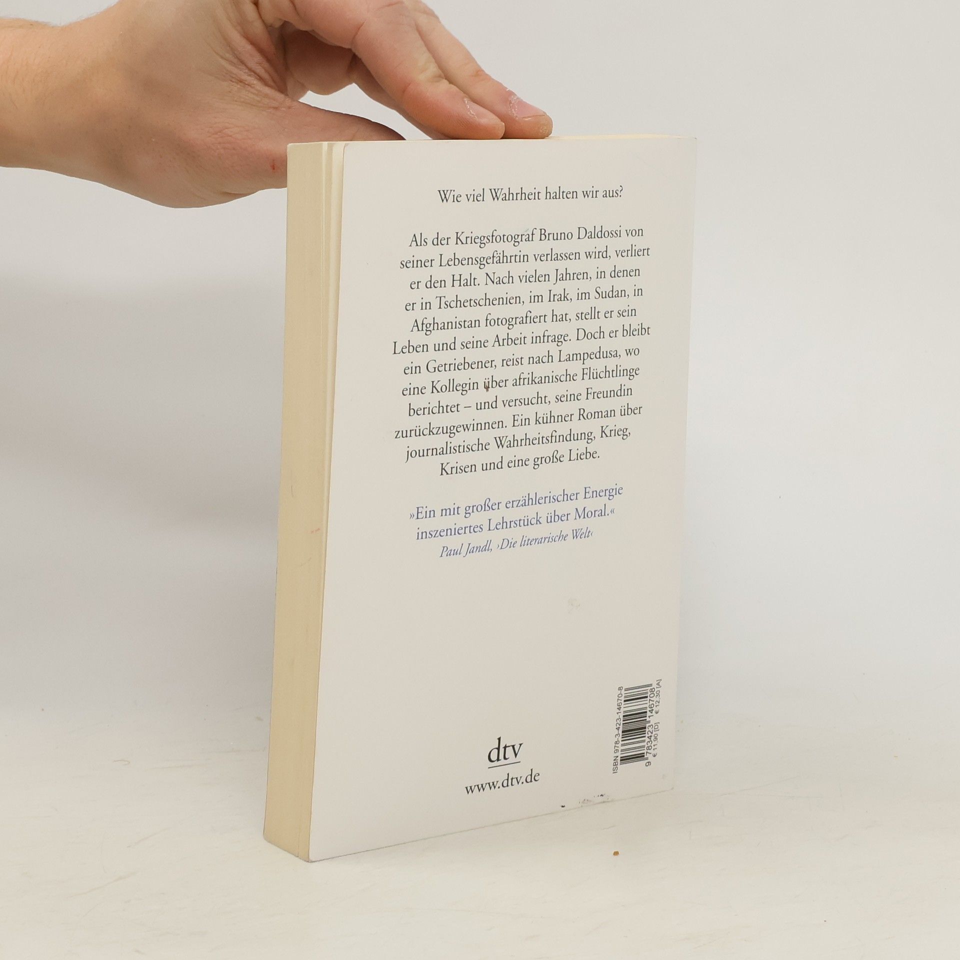 Wie viel Wahrheit halten wir aus? Bruno Daldossi ist Kriegsfotograf. Nach vielen Jahren, in denen er in Tschetschenien, im Irak, im Sudan, in Afghanistan fotografiert hat, reist er mit Anfang sechzig nur noch sporadisch in Krisengebiete. Als ihn aber seine langjährige Gefährtin Marlis, mit der er in Wien zusammenlebte, verlässt, verliert der so gehärtete Mann den Halt. In seine Trauer um den Liebesverlust mischt sich die Frage, wie mit dem Leid der Welt, das er in seinen Bildern festhält, zu leben ist. Daldossi freundet sich mit einer Journalistin an, die aus Lampedusa berichten soll, und reist ihr nach. Und er versucht, Marlis zurückzugewinnen und Verantwortung zu übernehmen für wenigstens einen Menschen, der seinen Weg gekreuzt hat.