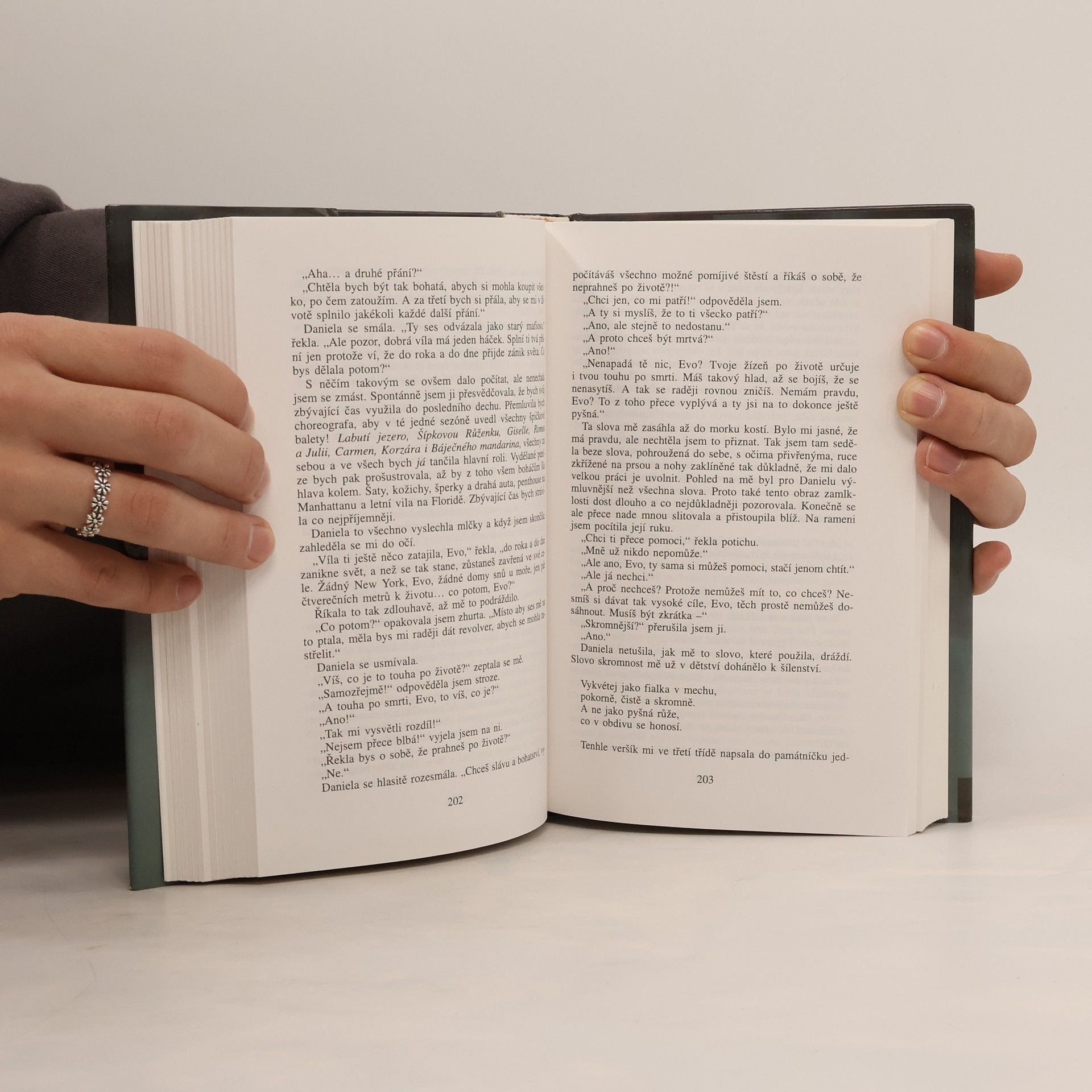 Hlavní hrdinka Eva Martinová se s rakovinou lymfatických uzlin dostává na radiologickou kliniku, kde sdílí pokoj s další nemocnou ženou Claudii. Přestože povahově jsou obě dívky velmi rozdílné, rozvíjí se mezi nimi pevné přátelství. Autorka nás s detailní autentičnosti a s velkým psychologickým napětím provází všemi fázemi rakoviny a terapií této nemoci. Kniha je prodchnuta přesvědčujícím přitakáním životu, o který se v těžkém boji musí každý rvát.
