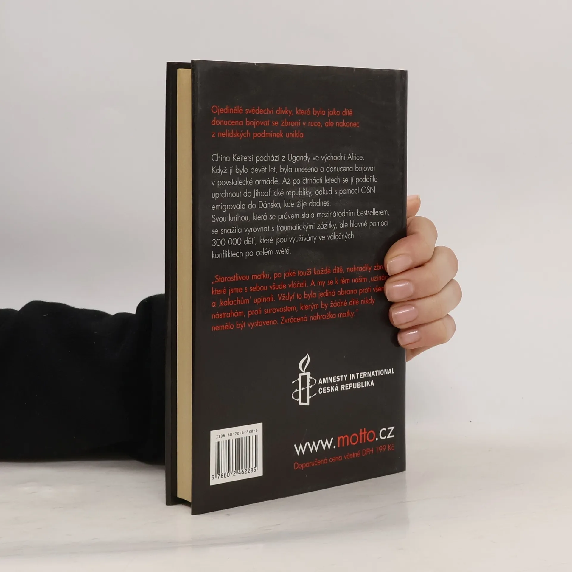 Podtitulkem knihy je: Místo panenky mi dali pušku. V knize autorka popisuje k čemu byla po léta nucena. O tom jak byla trápena, bita a znásilňována. Přibližuje ukrutnosti, které musejí dětští vojáci provádět i snášet. Ojedinělé svědectví dívky, která byla jako dítě donucena bojovat se zbraní v ruce, ale nakonec z nelidských podmínek unikla. China Keitetsi pochází z Ugandy ve východní Africe. Když jí bylo devět let, byla unesena a donucena bojovat v povstalecké armádě. Až po čtrnácti letech se jí podařilo uprchnout do Jihoafrické republiky, odkud s pomocí OSN emigrovala do Dánska, kde žije dodnes. Svou knihou, která se právem stala mezinárodním bestsellerem, se snažila vyrovnat se svými traumatickými zážitky, ale hlavně pomoci 300 000 dětí, které jsou využívány ve válečných konfliktech po celém světě.