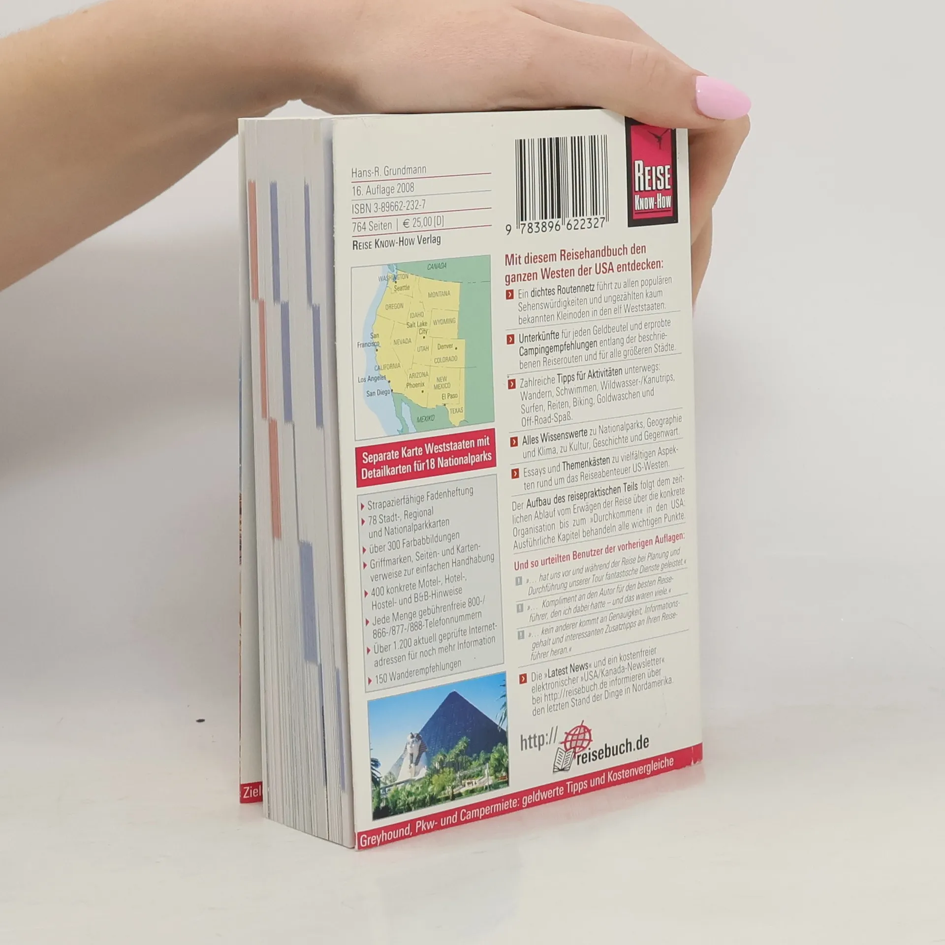 Der Westen der USA lockt nicht nur mit Highlights wie San Francisco und Los Angeles, Grand Canyon und Yellowstone Park, Las Vegas und dem Wilden Westen. Grandiose Landschaften und Naturwunder, präkolumbianische Relikte und Indianerkultur, wildromantische Küsten, glasklare Seen und Flüsse machen das Reisen auch abseits der Nationalparks und üblichen Pfade zum Erlebnis. Dieses Buch führt den Leser über ein dichtes Netz von Reiserouten zu allen populären Sehenswürdigkeiten und unzähligen kaum bekannten Kleinoden in den elf Weststaaten. Der Aufbau des reisepraktischen Teils folgt dem zeitlichen Ablauf vom Erwägen einer USA-Reise über die konkrete Planung und Vorbereitung bis hin zum touristischen Alltag unterwegs. Der Leser findet Kostenvergleiche und Entscheidungshilfen, zahlreiche praxisbezogene Tipps und Hinweise.