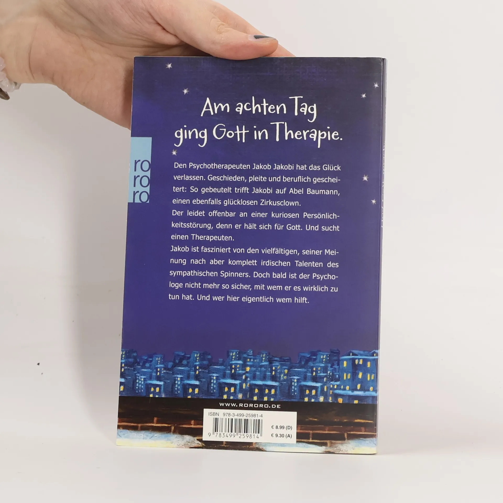 Am achten Tag ging Gott in Therapie Den Psychotherapeuten Jakob Jakobi hat das Glück verlassen. Geschieden, pleite und beruflich gescheitert: So gebeutelt trifft Jakobi auf Abel Baumann, einen ebenfalls glücklosen Zirkusclown.Der leidet offenbar an einer kuriosen Persönlichkeitsstörung, denn er hält sich für Gott. Und sucht einen Therapeuten. Jakob ist fasziniert von den vielfältigen, seiner Meinung nach aber komplett irdischen Talenten des sympathischen Spinners. Doch bald ist der Psychologe nicht mehr so sicher, mit wem er es wirklich zu tun hat. Und wer hier eigentlich wem hilft.