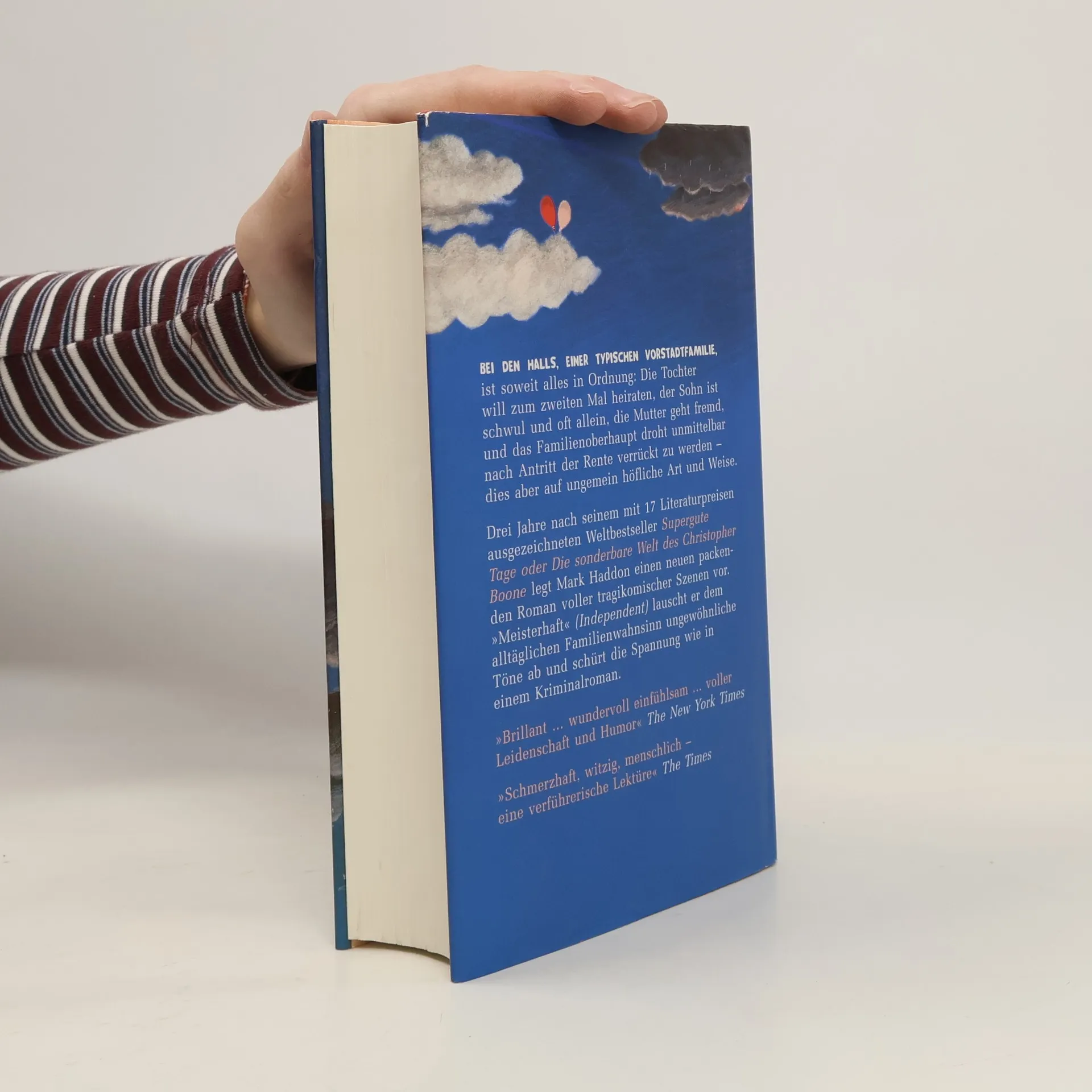 Bei den Halls, einer typischen Vorstadtfamilie, hat jeder seinen wunden Punkt: Die Tochter will zum zweiten Mal heiraten, der Sohn ist schwul und oft allein, die Mutter geht fremd, und George, das Familienoberhaupt, entdeckt einen verdächtigen Fleck an seiner Hüfte, wo eigentlich keiner sein sollte. Meisterhaft gewinnt Mark Haddon dem ganz gewöhnlichen Familienwahnsinn ungewöhnliche Töne ab. Ein packender Roman voller tragikomischer Szenen!