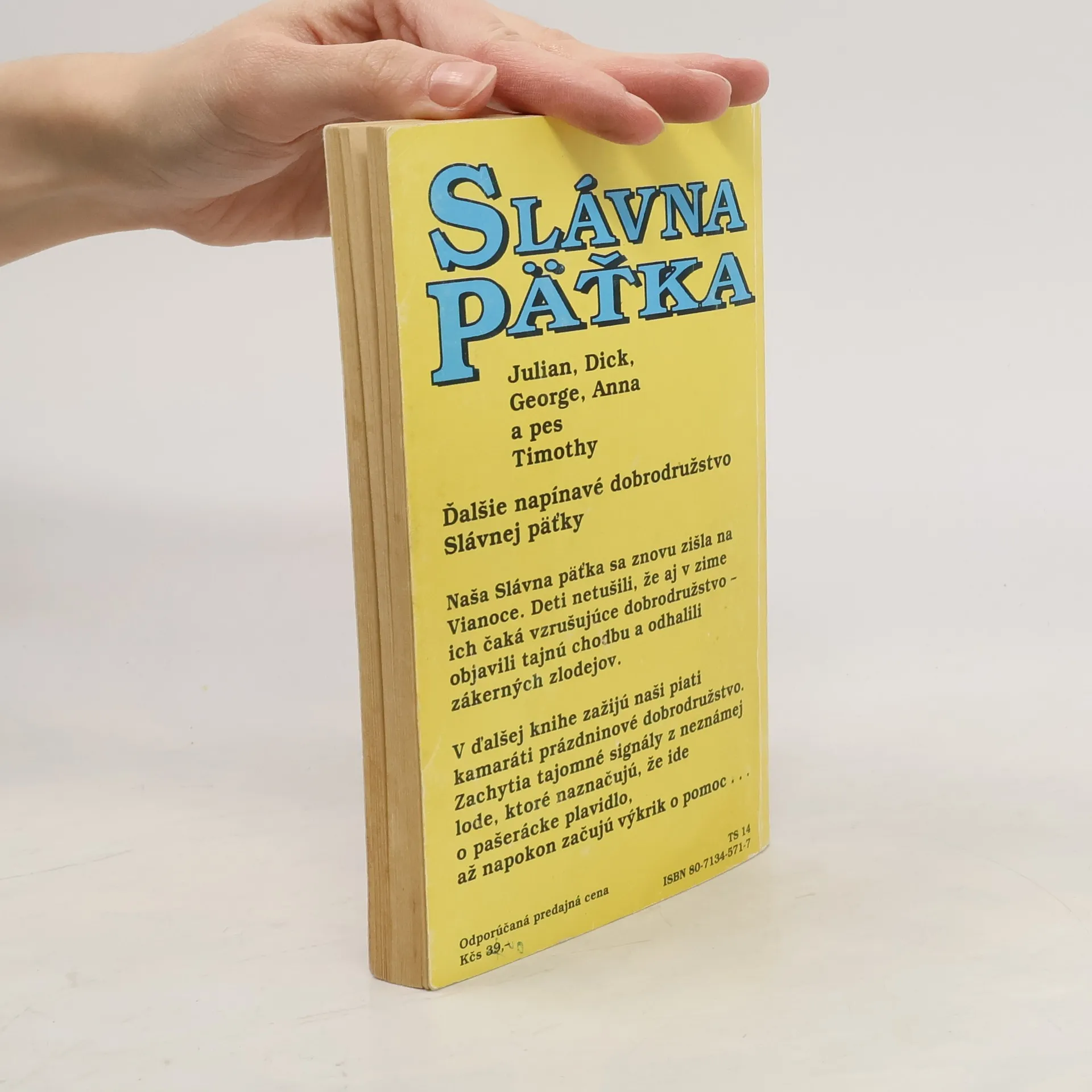 Nové vydanie obľúbenej dobrodružnej série zaujme malých i veľkých. Slávna päťka, to sú v skutočnosti štyri deti a pes. Julian, Dick, George, či vlastne Georgina, Anna a pes Timothy. Čo všetko zažili na pustom ostrove? Aké dobrodružstvo ich postretlo pri plavbe na mori či v noci v zrúcanine starého hradu? Čo objavili v starom potopenom vraku? A ako vyzerá ozajstné hľadanie pokladu?