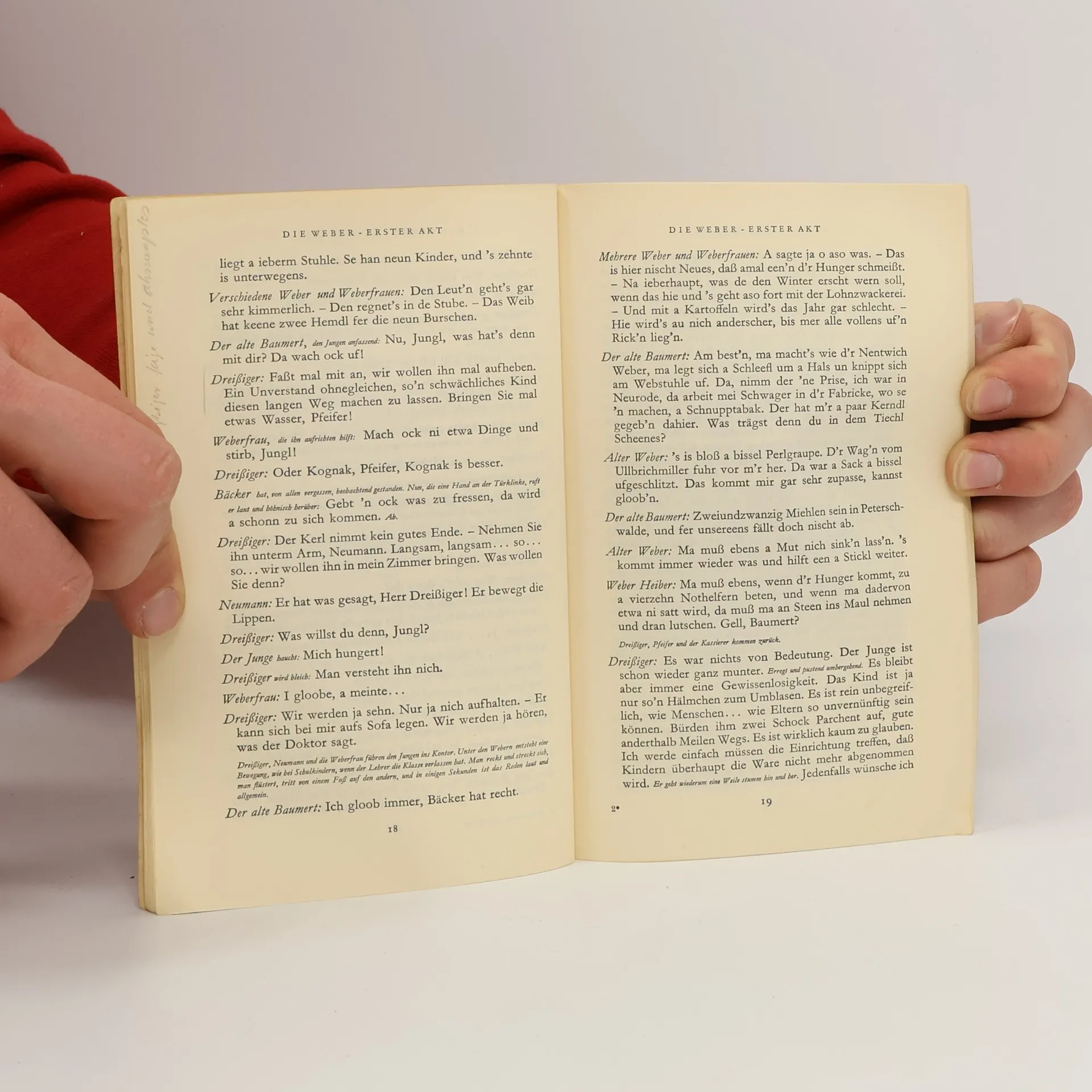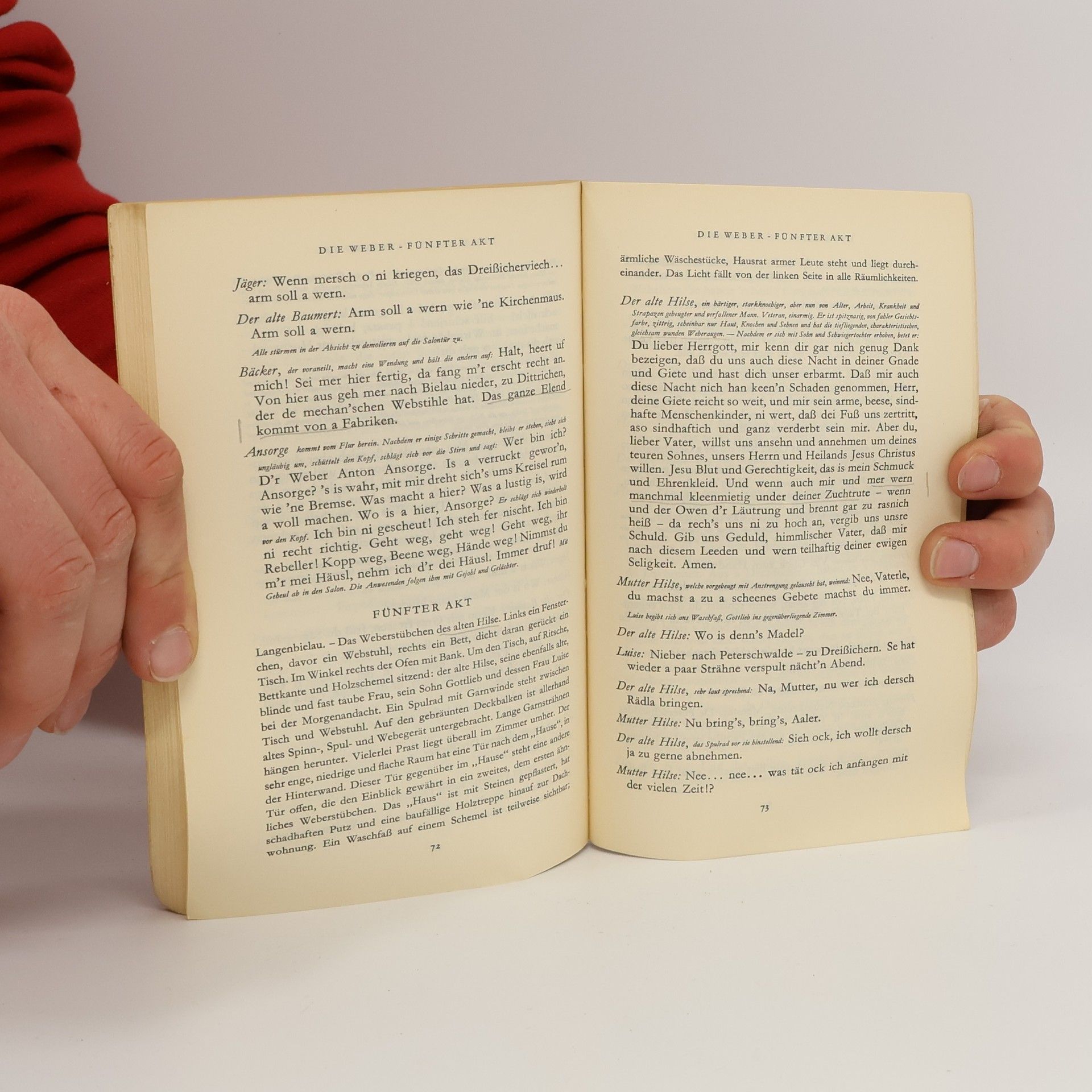 Ein Funke genügt: Als ein hungerleidender Junge zusammenbricht, kommt es zu Protesten der ausgebeuteten Weber vor der Villa des Fabrikanten Dreißiger. Die Situation eskaliert. Hauptmanns Drama über den schlesischen Weberaufstand von 1844 war ein Politikum – der ersten öffentlichen Aufführung in Berlin 1894 ging ein langwieriger Zensurprozess voraus, Kaiser Wilhelm II. kündigte seine Loge im »Deutschen Theater«, Sozialdemokraten jubelten. Es betrat aber auch ästhetisches Neuland: Nicht mehr ein Individuum ist »Held« des Dramas, sondern eine Gruppe gleichförmiger Elendsgestalten – die Weber.