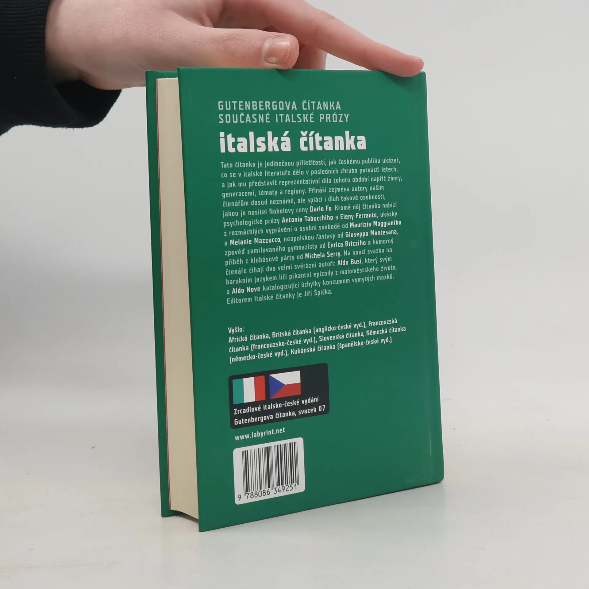 Gutenbergova čítanka současné italské prózy. Tato čítanka je jedinečnou příležitostí, jak českému publiku ukázat, co se v italské literatuře dělo v posledních zhruba patnácti letech, a jak mu představit reprezentativní díla tohoto období napříč žánry, generacemi, tématy a regiony. Přináší zejména autory našim čtenářům dosud neznámé, ale splácí i dluh takové osobnosti, jakou je nositel Nobelovy ceny Dario Fo. Kromě něj čítanka nabízí psychologické prózy Antonia Tabucchiho a Eleny Ferrante, ukázky z rozmáchlých vyprávění o osobní svobodě od Maurizia Maggianiho a Melanie Mazzucco, neapolskou fantasy od Giuseppa Montesana, zpověď zamilovaného gymnazisty od Enrica Brizziho a humorný příběh z klobásové párty od Michela Serry. Na konci svazku na čtenáře číhají dva velmi svérázní autoři: Aldo Busi, který svým barokním jazykem líčí pikantní epizody z maloměstského života, a Aldo Nove katalogizující úchylky konzumem vymytých mozků. Zrcadlové italsko-české vydání. 1. vyd.