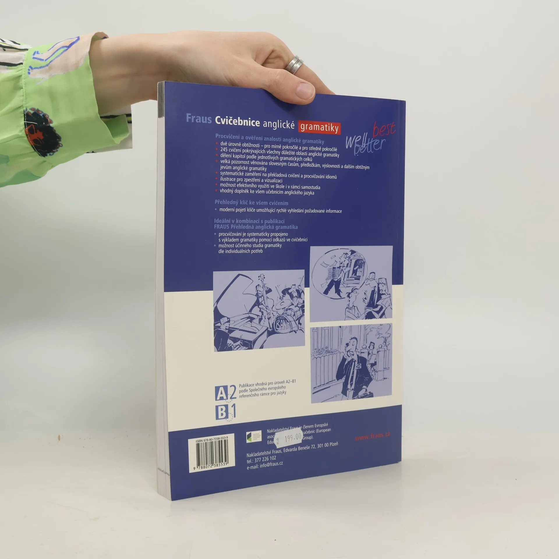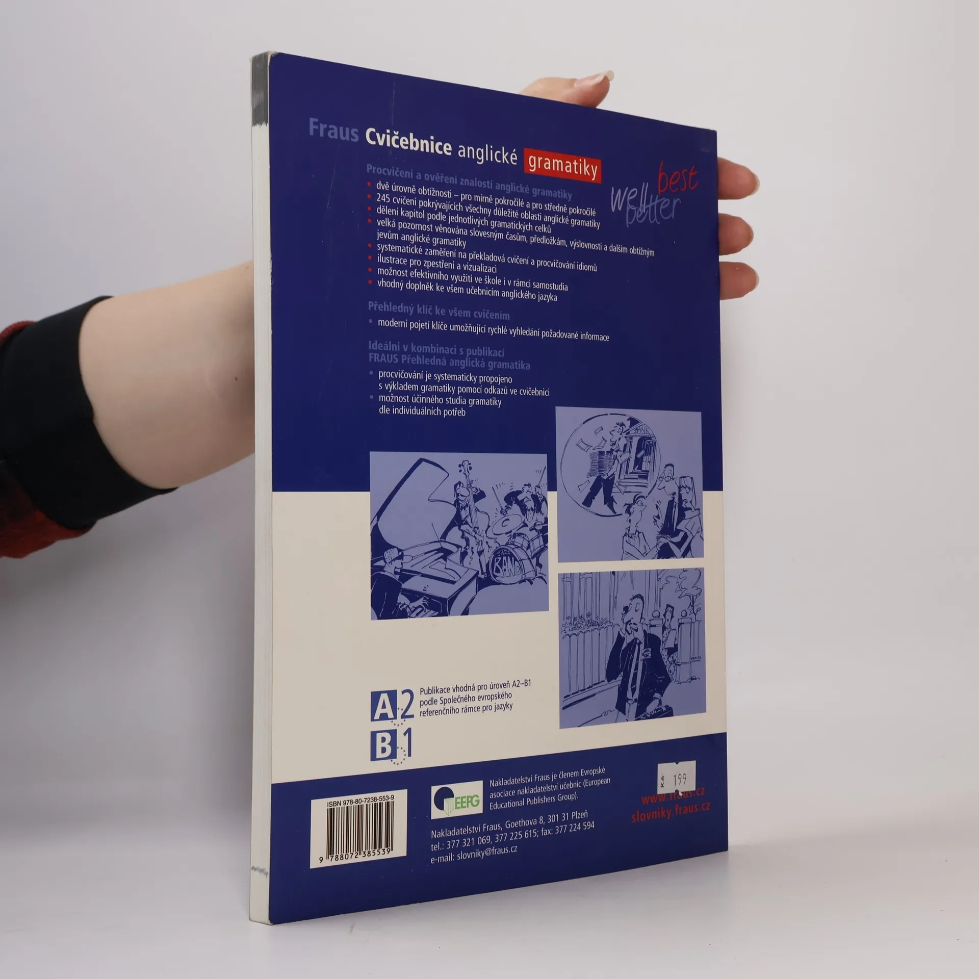 Publikace k procvičení a ověření znalostí anglické gramatiky dvě úrovně obtížnosti – pro mírně pokročilé a pro středně pokročilé 245 cvičení pokrývajících všechny důležité oblasti anglické gramatiky dělení kapitol podle jednotlivých gramatických celků velká pozornost věnována slovesným časům, předložkám, výslovnosti a dalším obtížným jevům anglické gramatiky systematické zaměření na překladová cvičení a procvičování idiomů ilustrace pro zpestření a vizualizaci možnost efektivního využití ve škole i v rámci samostudia vhodný doplněk ke všem učebnicím anglického jazyka Přehledný klíč ke všem cvičením moderní pojetí klíče umožňující rychlé vyhledání požadované informace Ideální v kombinaci s publikací FRAUS Přehledná anglická gramatika procvičování je systematicky propojeno s výkladem gramatiky pomocí odkazů ve cvičebnici možnost účinného studia gramatiky dle individuálních potřeb