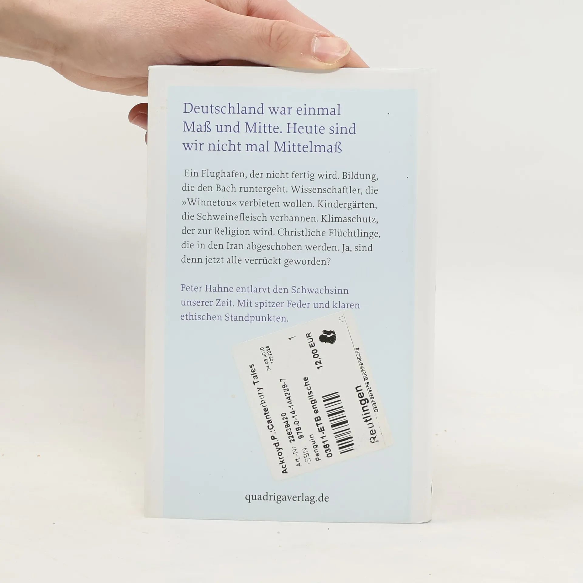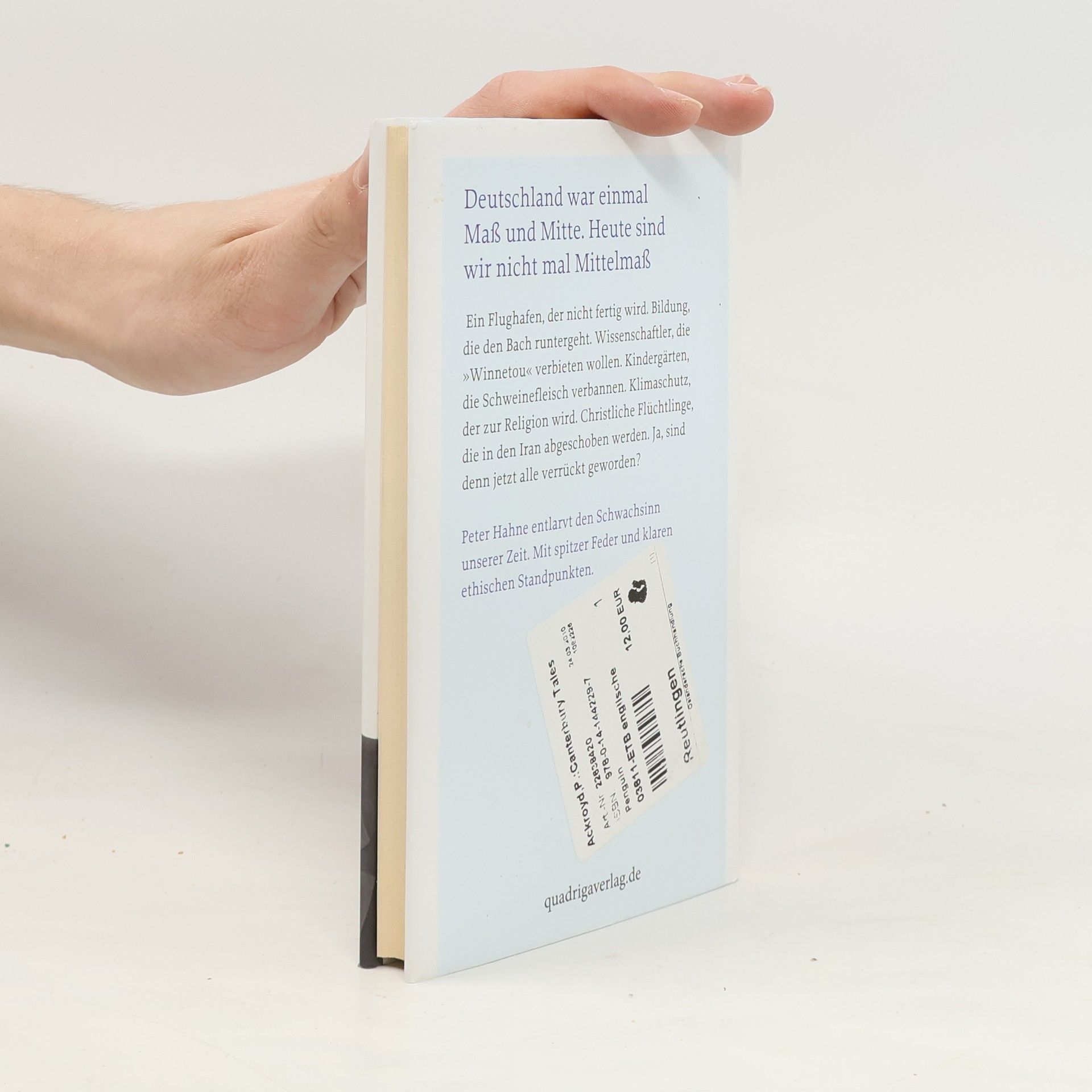 Deutschland war einmal Maß und Mitte. Heute sind wir nicht mal Mittelmaß. Ein Flughafen, der nicht fertig wird. Bildung, die den Bach runtergeht. Wissenschaftler, die „Winnetou“ verbieten wollen. Kindergärten, die Schweinefleisch verbannen. Klimaschutz, der zur Religion wird. Christliche Flüchtlinge, die in den Iran abgeschoben werden. Ja, sind denn jetzt alle verrückt geworden? Peter Hahne entlarvt den Schwachsinn unserer Zeit. Mit spitzer Feder und klaren ethischen Standpunkten.
