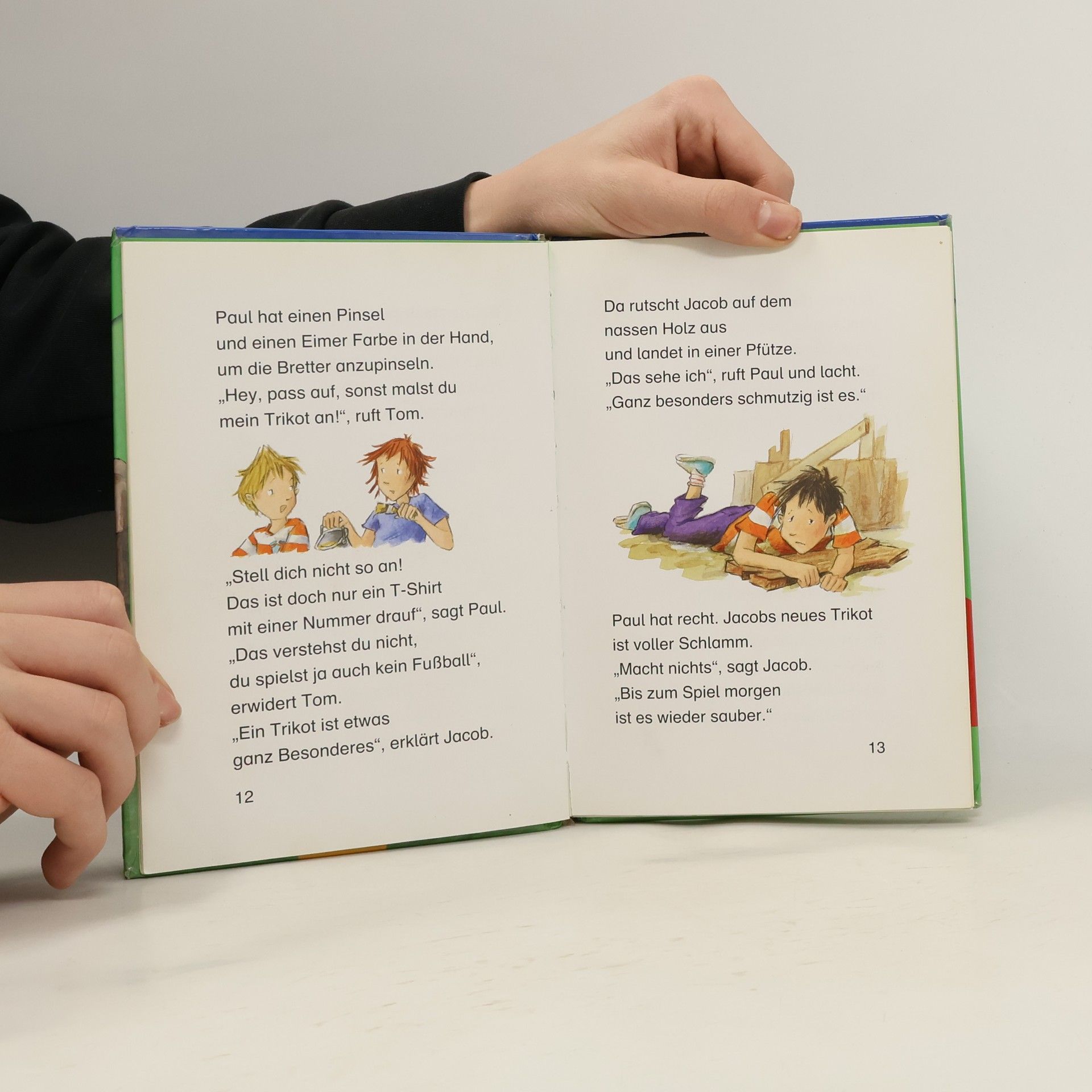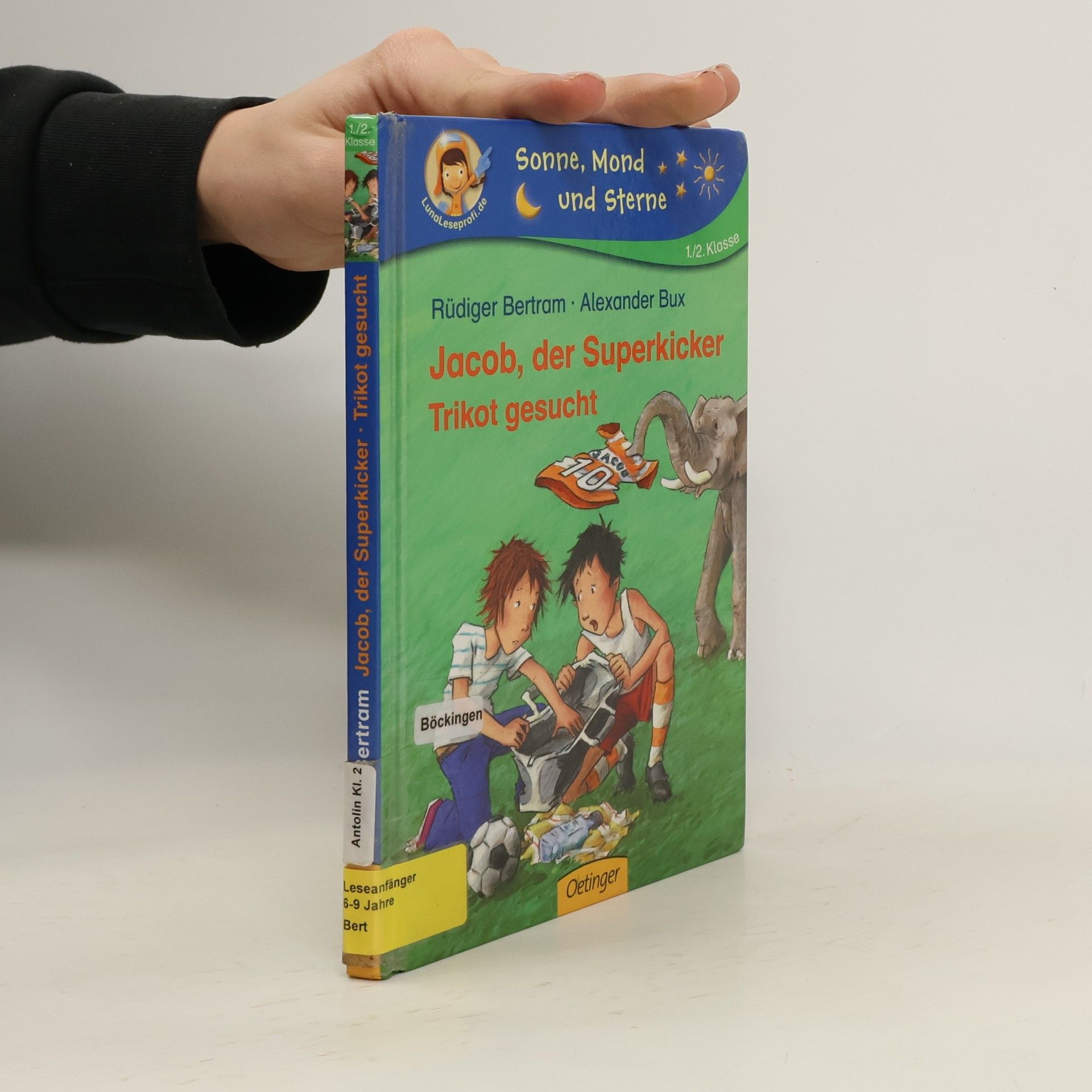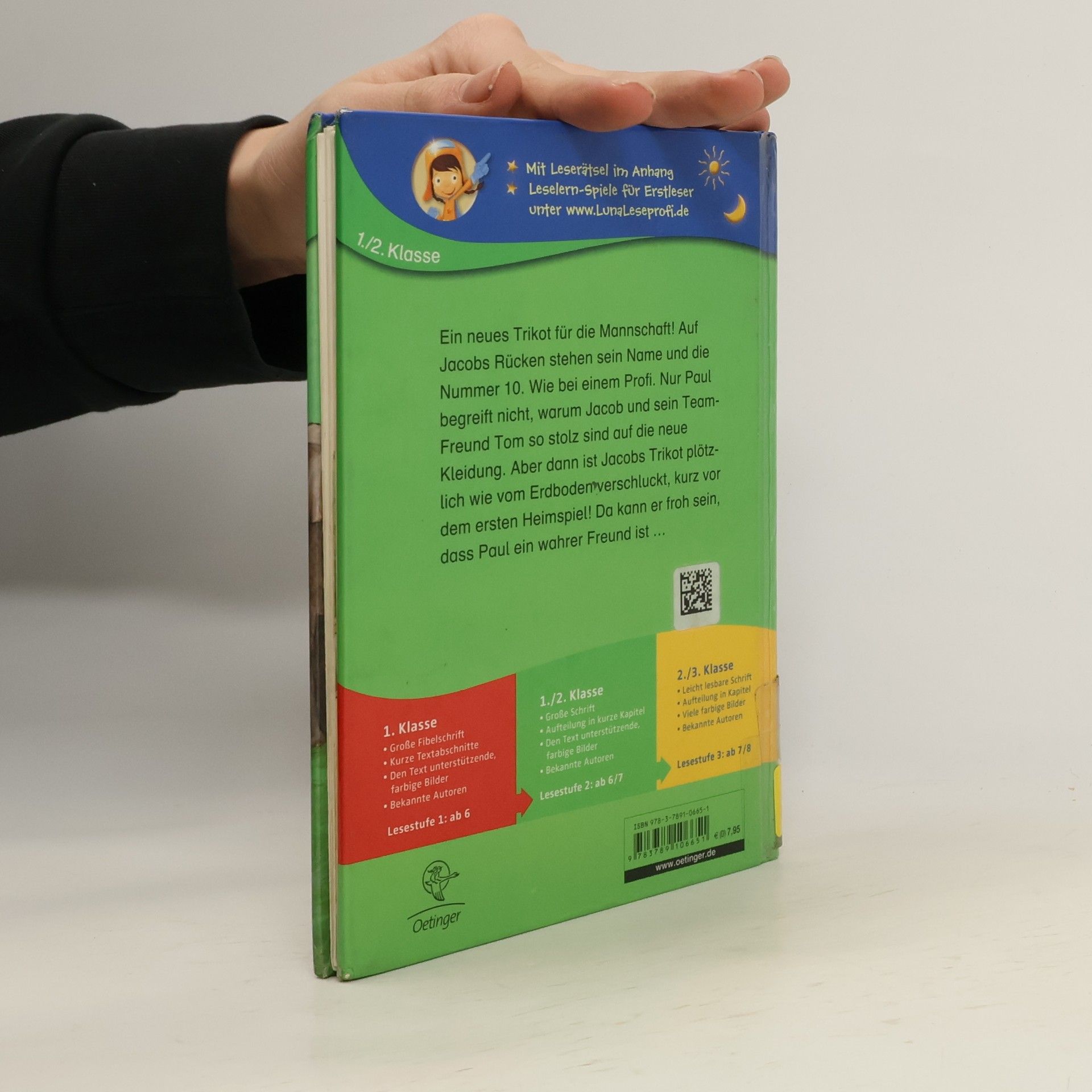 Jacob und Tom sind begeisterte Fussballer und gerade beim Spielen, als der Trainer ihnen neue Trikots mit aufgedruckten Namen und Nummern mitbringt. Natürlich trägt die Mahnung, sorgsam damit umzugehen, nicht lange. So kommt es, dass Jacob auf dem Spielplatz mit dem Trikot im Matsch landet. Zu Hause steckt er es in Waschmaschine und Trockner, legt es auf einem Wäschestapel zum Mitnehmen bereit, bis er wieder zum Sportplatz muss. Doch der Schrecken ist gross, als der ganze Wäschestapel weg ist. Er wurde in eine Altkleidersammlung gegeben. Jacob jagt mit Freund Paul hinterher ... - So knapp die locker illustrierte Story mit ihren kurzen, gross gedruckten Satzabschnitten auch ist (zuvor: "Jacob, der Superkicker"), sie ist spannend, alltagsnah und lockt zum Lesen bis zum Happy End. - Dem Reihenkonzept entsprechend, folgen Fragen zum Leseverständnis am Schluss; überdies geht es über das Lösungswort unter www.lunaLeseprofi.de, Benutzername und Code-Wort zum Weiterspielen. - Auch ohne das online-Nachspiel - heitere Erstleserlektüre, vor allem für Jungen. Breit einsetzbar. Ab 6