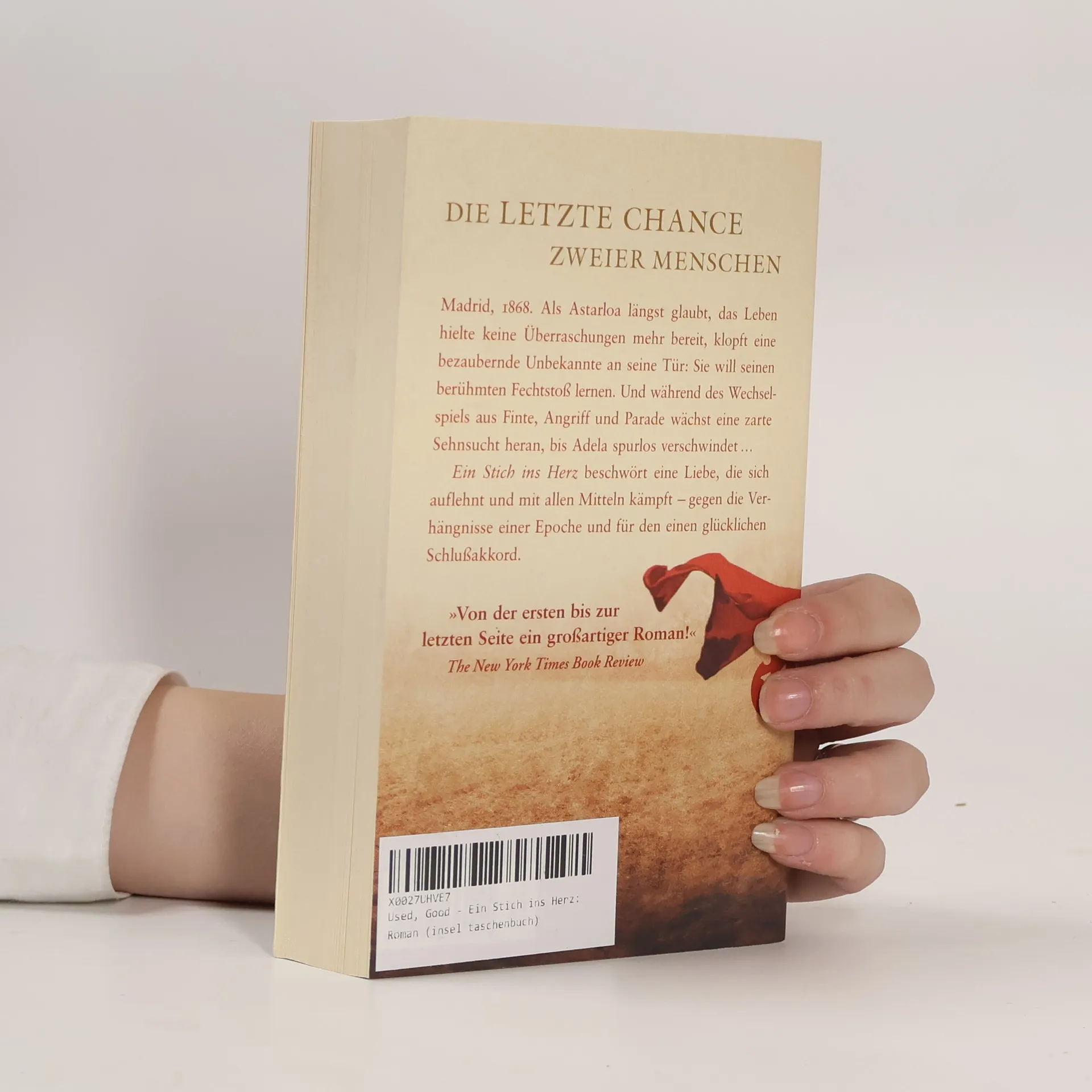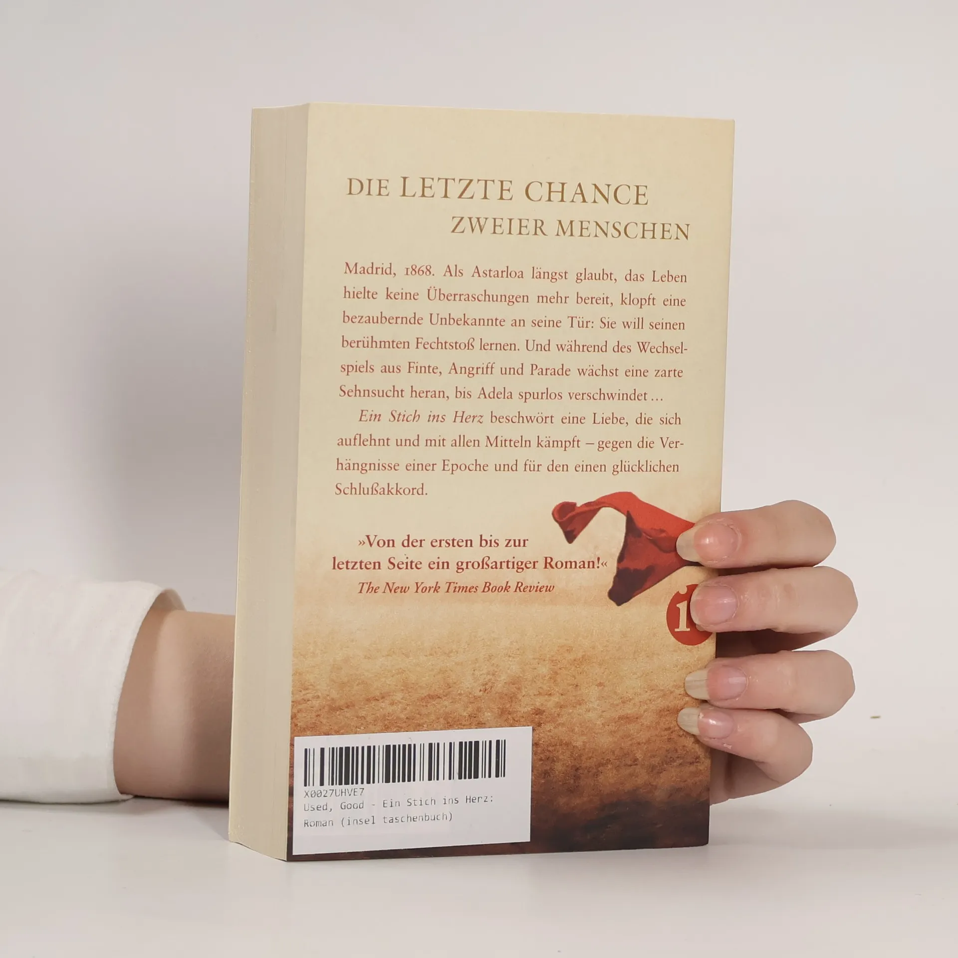 Madrid, 1868. Als Astarloa längst glaubt, das Leben hielte keine Überraschungen mehr für ihn bereit, klopft eine bezaubernde Unbekannte an seine Tür: Sie will seinen berühmten Fechtstoß lernen. Aber er hat nicht vor, seine Ruhe aufs Spiel zu setzen, gerade jetzt, wo die Hauptstadt täglich von blutigen Aufständen erschüttert wird. Doch die Anmut der Dame, ihre geheimnisvolle Narbe und die veilchenblauen Augen wecken seine Neugier. Sie wird seine Schülerin, und während des Wechselspiels aus Finte, Angriff und Parade wächst über Wochen eine zarte Liebe heran, bis Adela spurlos verschwindet. Und für den Fechtmeister beginnt eine bodenlose Suche nach der Wahrheit in den Gassen der Stadt ... Arturo Pérez-Reverte erzählt gefühlvoll und rasant von der letzten Chance zweier Menschen. Ein Stich ins Herz beschwört eine Liebe, die sich auflehnt und mit allen Mitteln kämpft – gegen die Verhängnisse einer Epoche und für den einen glücklichen Schlussakkord.