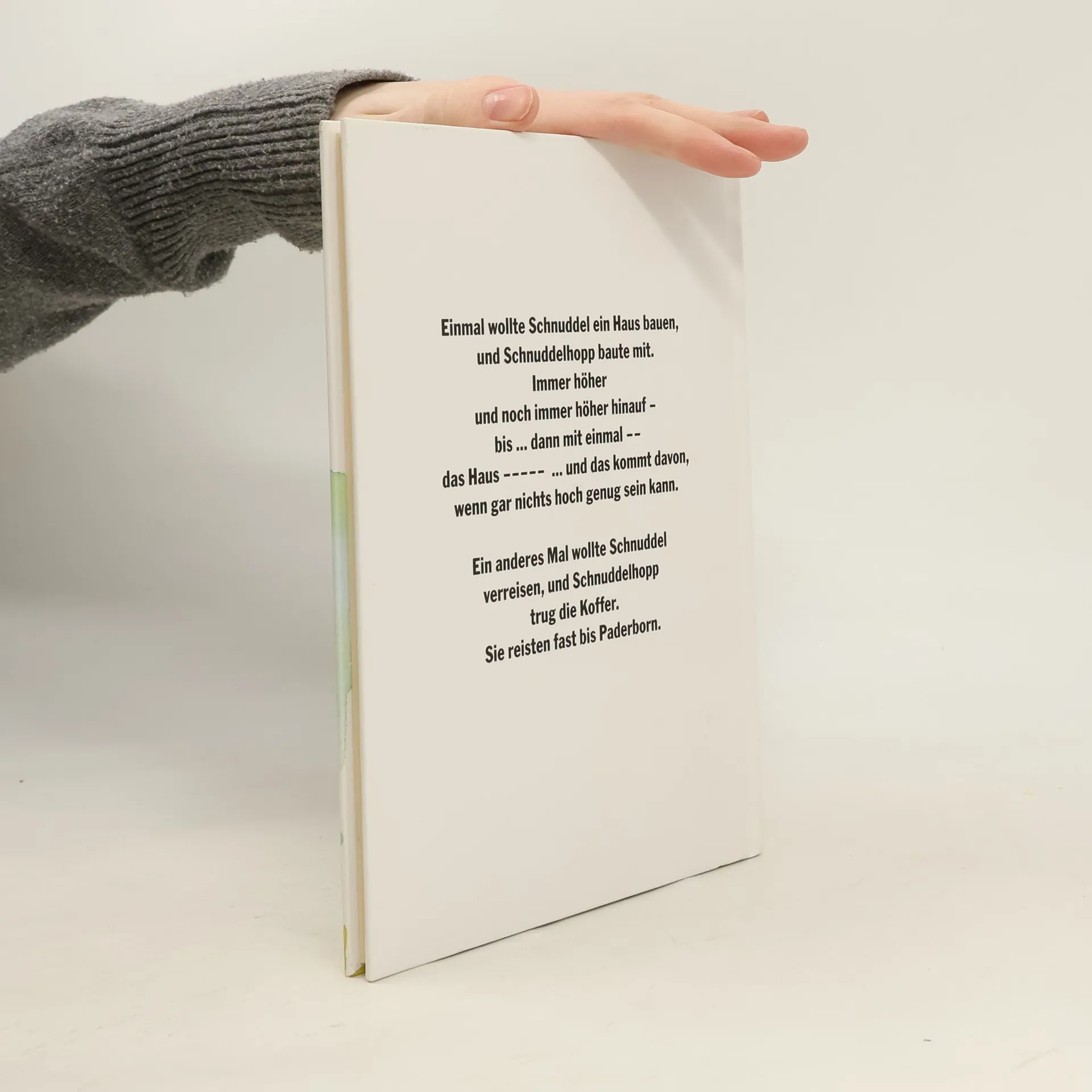 Einmal wollte Schnuddel ein Haus bauen, und Schnuddelhopp baute mit. Immer höher und noch höher hinaus – bis… Dann mit einmal - - das Haus - - - - … und das kommt davon, wenn gar nichts hoch genug sein kann. Ein anderes Mal wollte Schnuddel verreisen, und Schnuddelhopp trug die Koffer. Sie reisten fast bis Paderborn.