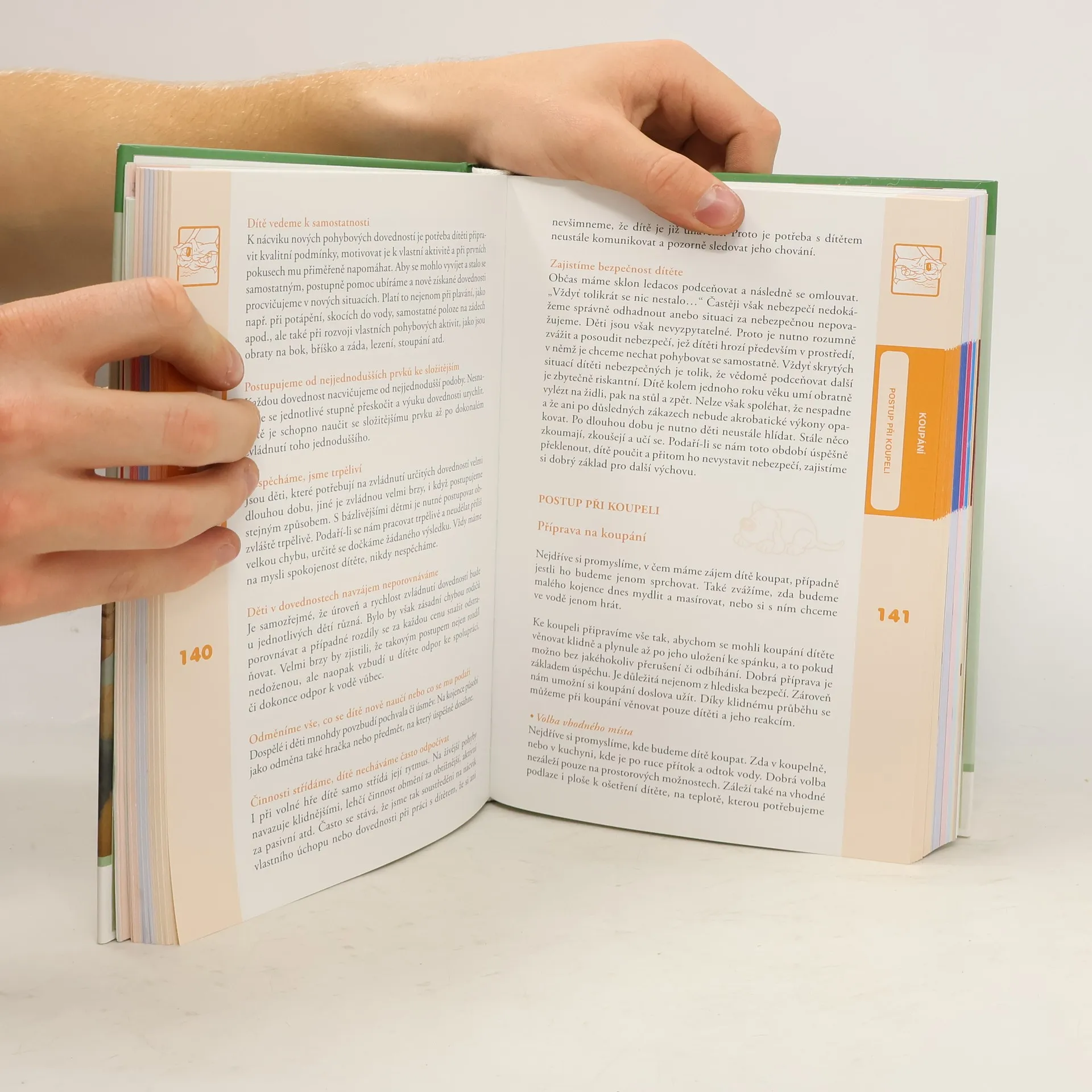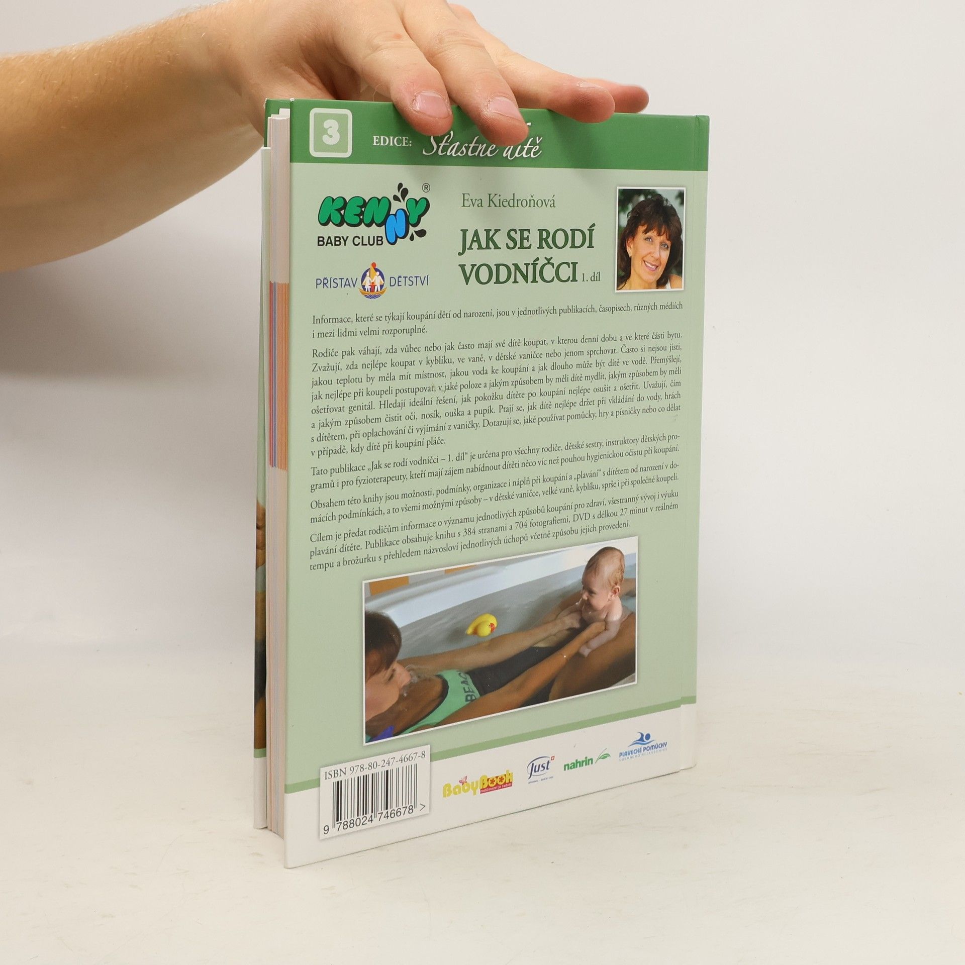 Kniha poskytuje informace, které se týkají koupání novorozenců a malých kojenců. Radí rodičům, zda vůbec nebo jak často mají své dítě koupat, v kterou denní dobu a v které části bytu, zda nejlépe koupat v kyblíku, ve vaně, v dětské vaničce nebo jenom sprchovat. Radí jakou teplotu by měla mít místnost, jakou voda ke koupání a jak dlouho může být dítě ve vodě. Zejména pak, jak nejlépe při koupeli postupovat, v jaké poloze a jakým způsobem by měli dítě mydlit, jakým způsobem by měli ošetřovat genitál, jak pokožku dítěte po koupání nejlépe osušit a ošetřit, jakým způsobem čistit oči, nosík, ouška a pupík. V knize se dozvíte jaké používat pomůcky, hry a písničky nebo co dělat v případě, kdy dítě při koupání pláče.