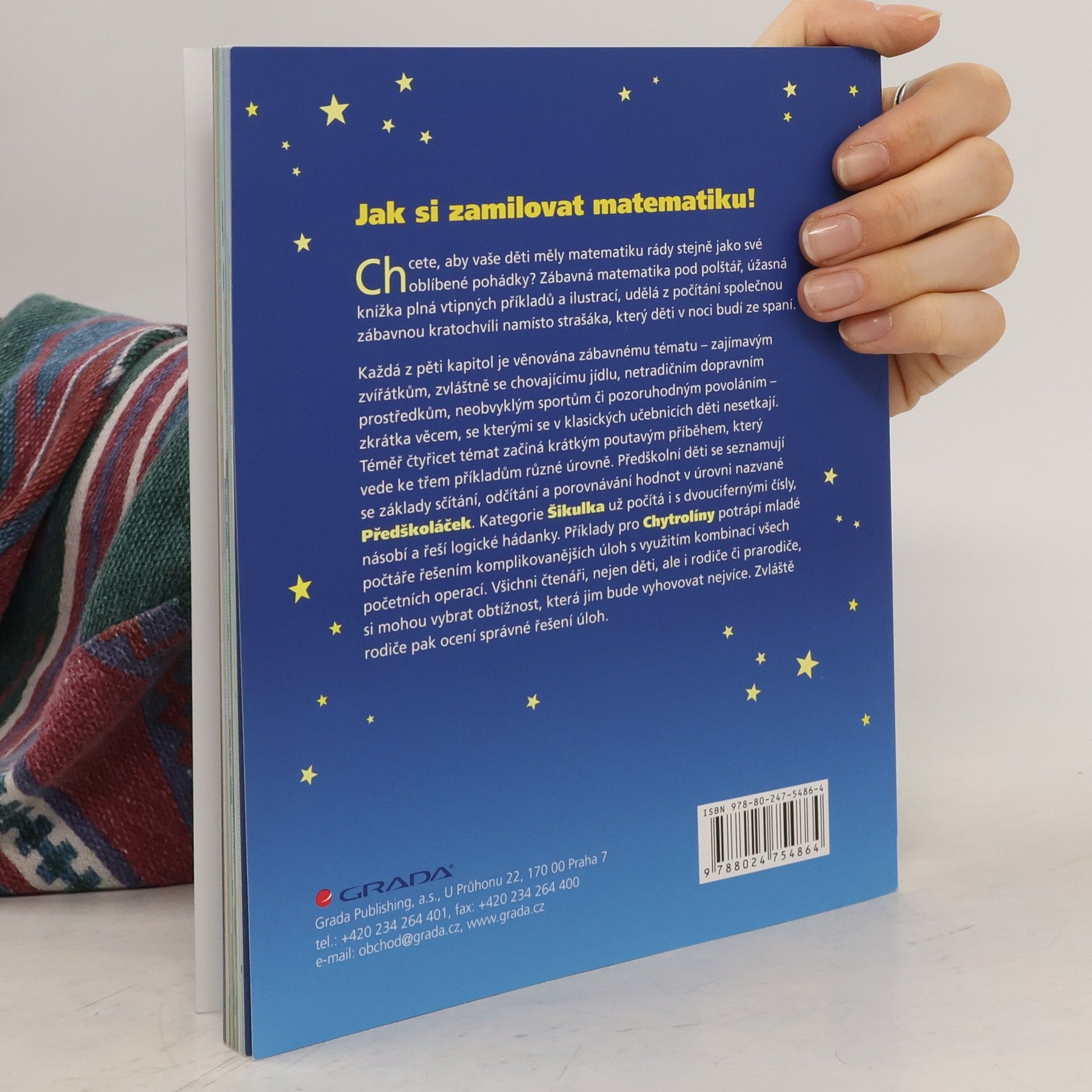 JAK SI ZAMILOVAT MATEMATIKU! Každá z pěti kapitol je věnována zábavnému tématu – zajímavým zvířátkům, zvláštně se chovajícímu jídlu, netradičním dopravním prostředkům, neobvyklým sportům či pozoruhodným povoláním – zkrátka věcem, se kterými se v klasických učebnicích děti nesetkají. Téměř čtyřicet témat začíná krátkým poutavým příběhem, který vede ke třem příkladům různé úrovně. Předškolní děti se seznamují se základy sčítání, odčítání a porovnávání hodnot v úrovni nazvané Předškoláček. Kategorie Šikulka už počítá i s dvoucifernými čísly, násobí a řeší logické hádanky. Příklady pro Chytrolíny potrápí mladé počtáře řešením komplikovanějších úloh s využitím kombinací všech početních operací. Všichni čtenáři, nejen děti, ale i rodiče či prarodiče, si mohou vybrat obtížnost, která jim bude vyhovovat nejvíce. Zvláště rodiče pak ocení správné řešení úloh.